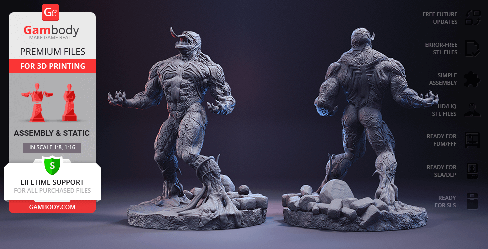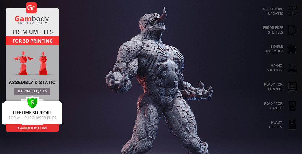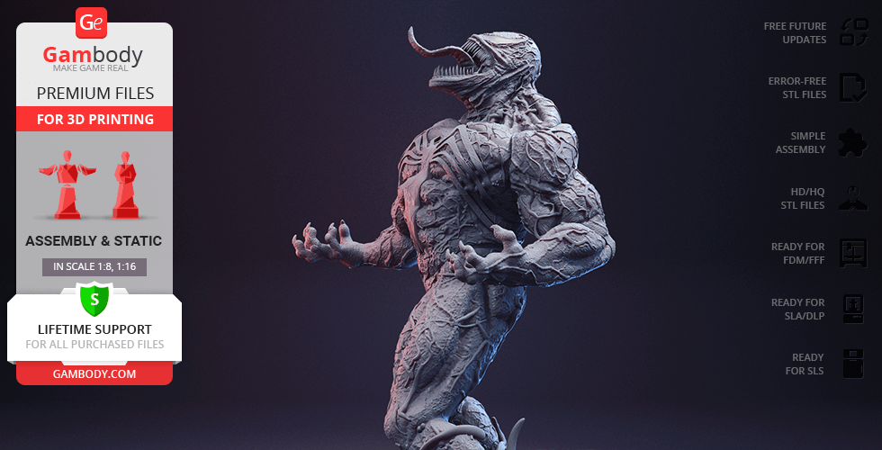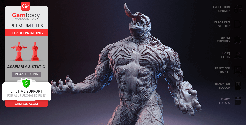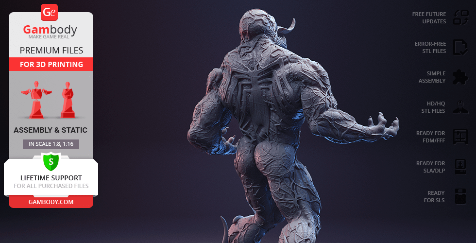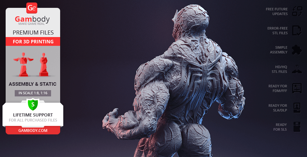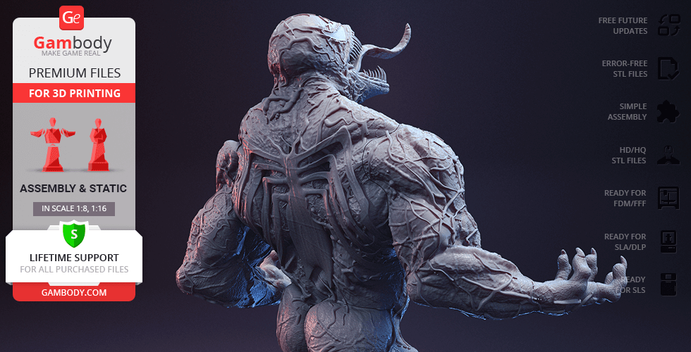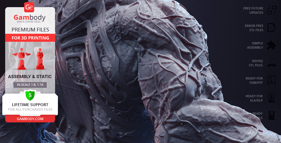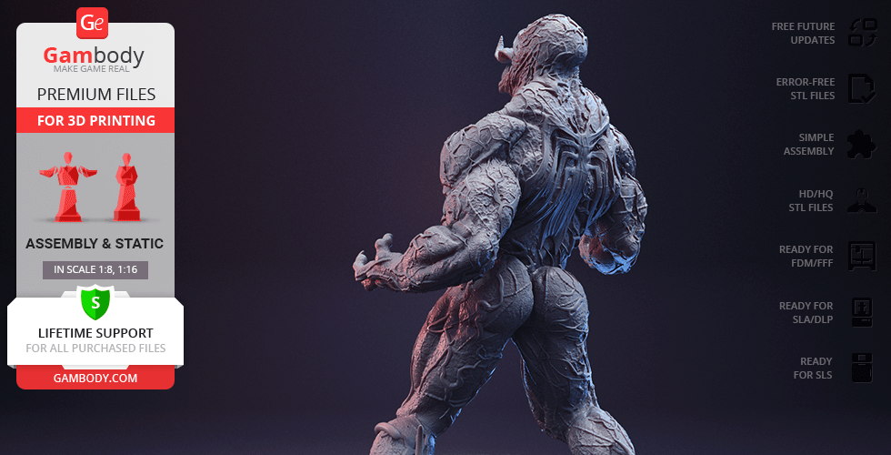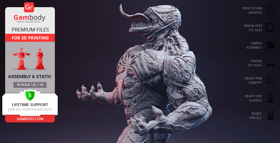 Venom figurine for 3D printing is a static assembly model and its moderation and adaptation for different types of 3D printers took Gambody team 37 hours. Figurine’s anatomy and body proportions were reviewed during the moderation for the muscular symbiote to be depicted harmoniously in the intended pose.