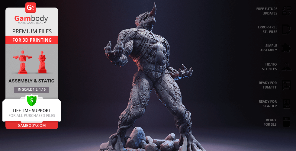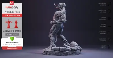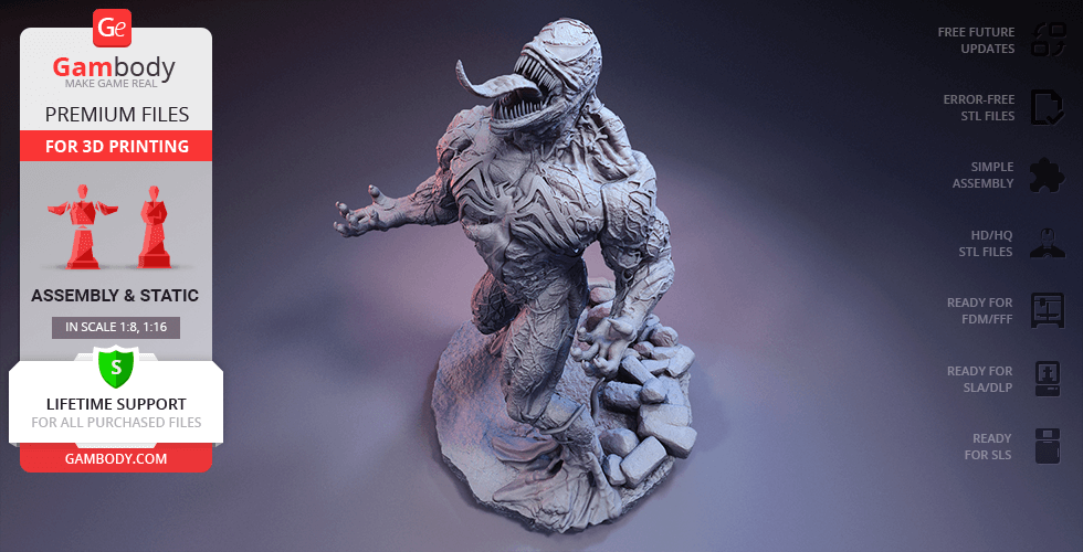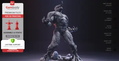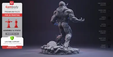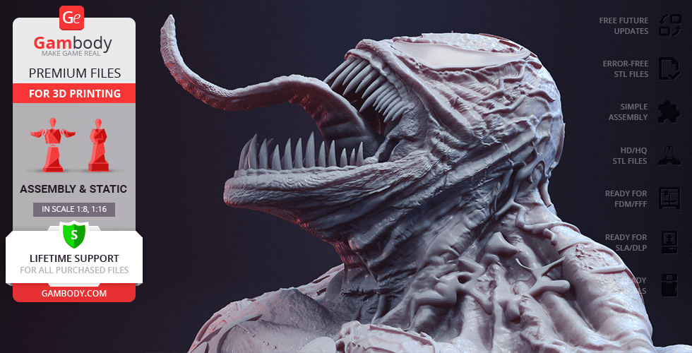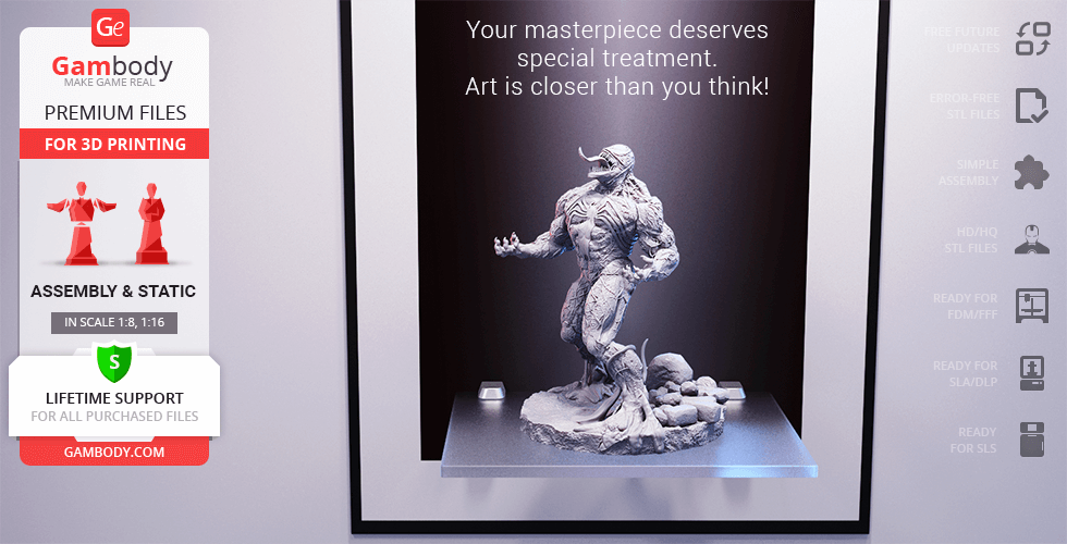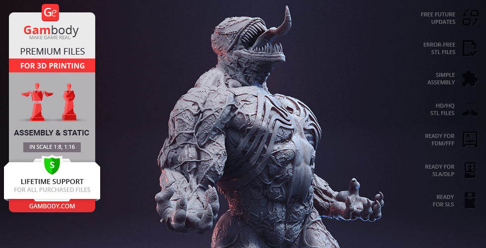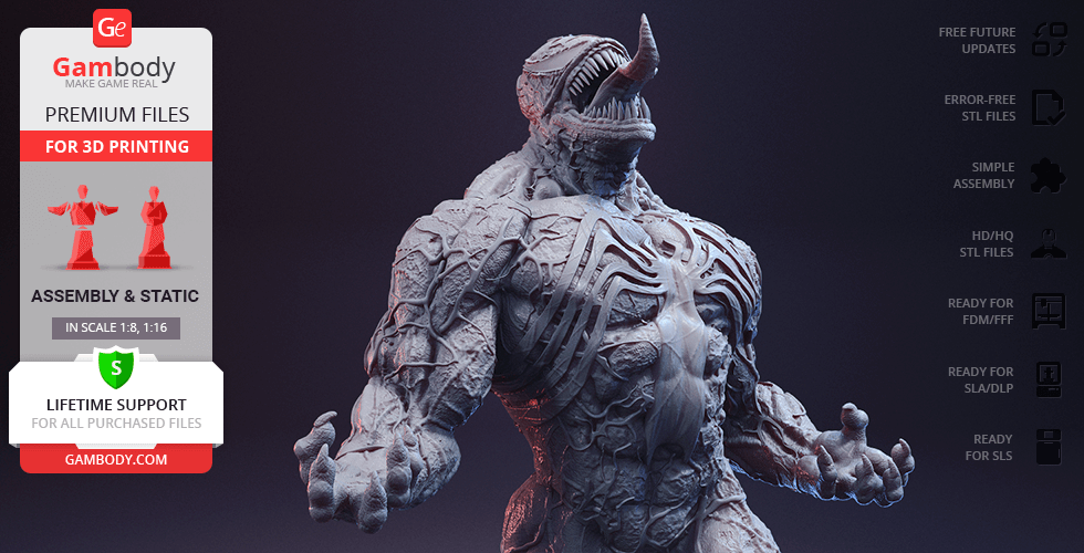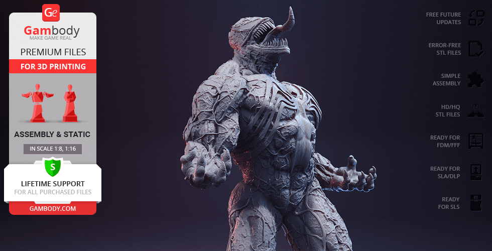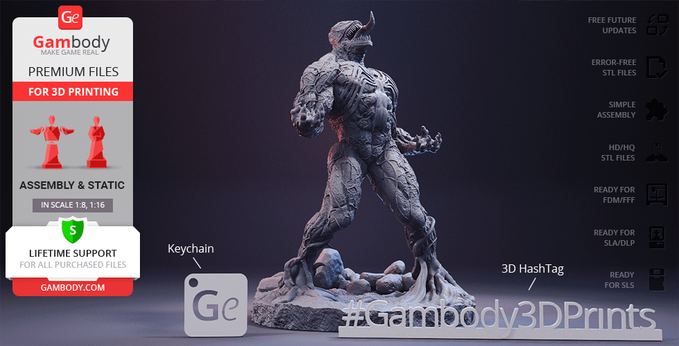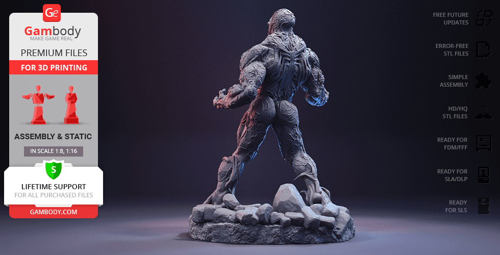 Venom figurine for 3D printing is a static assembly model and its moderation and adaptation for different types of 3D printers took Gambody team 37 hours. Figurine’s anatomy and body proportions were reviewed during the moderation for the muscular symbiote to be depicted harmoniously in the intended pose.