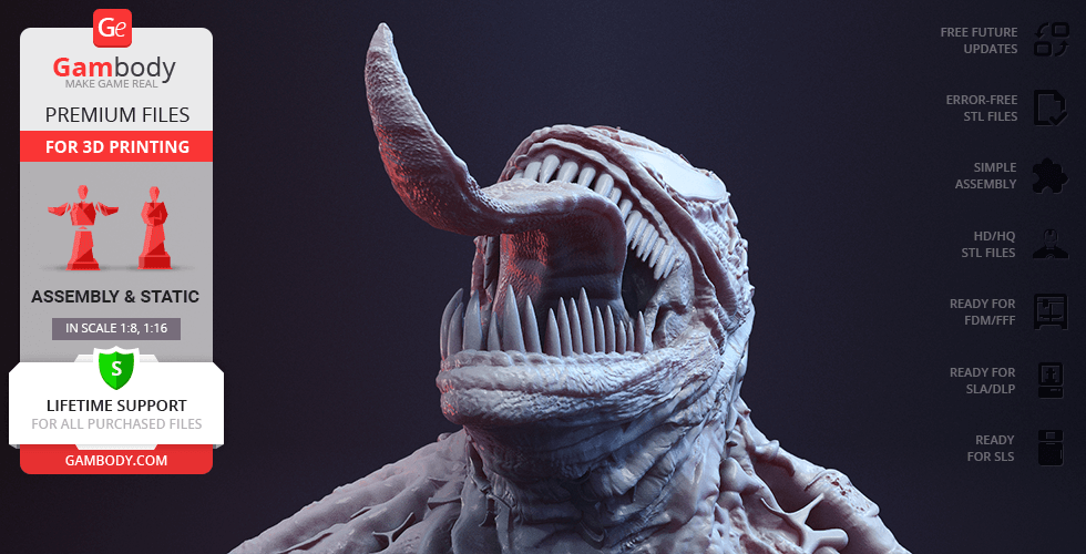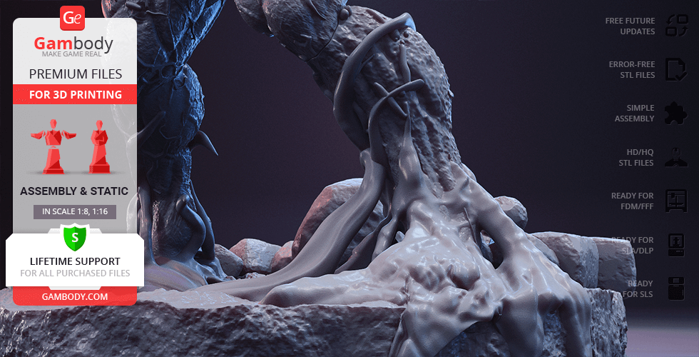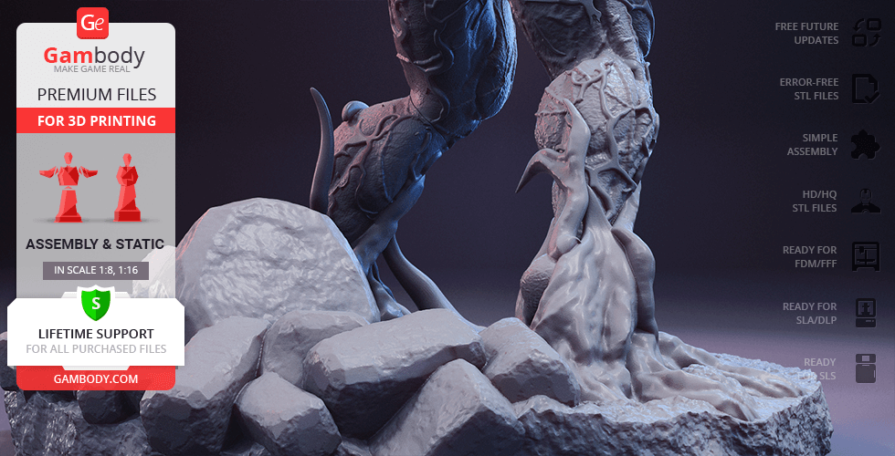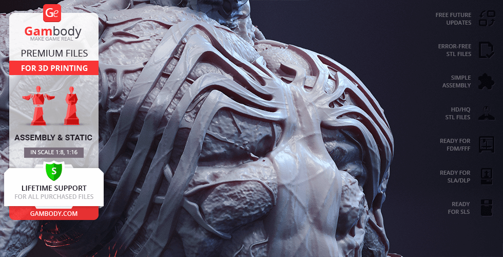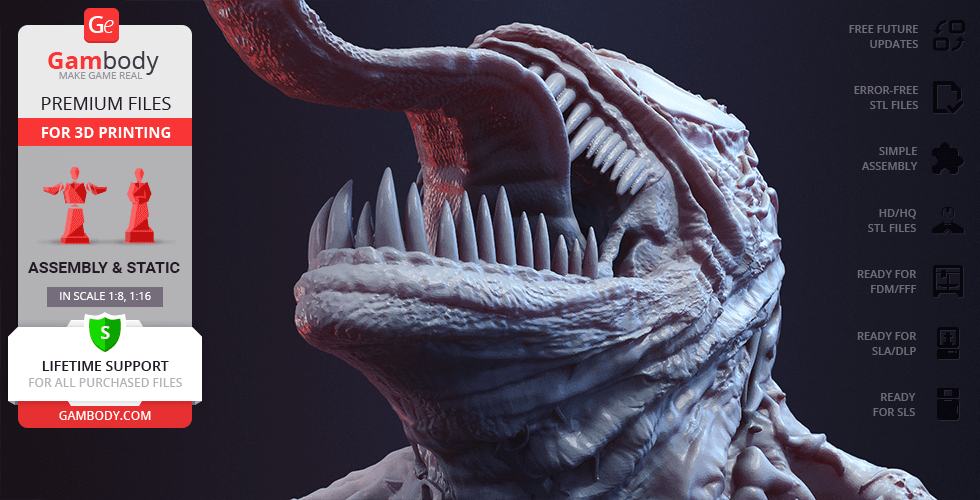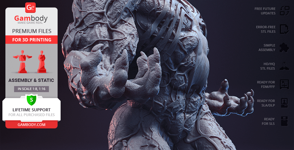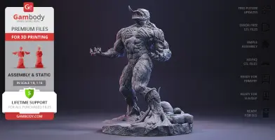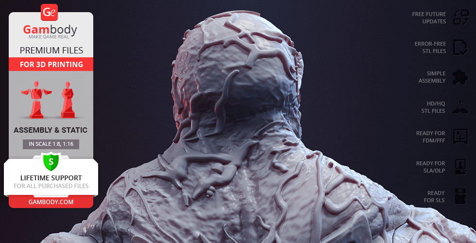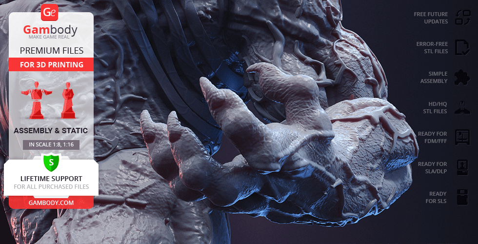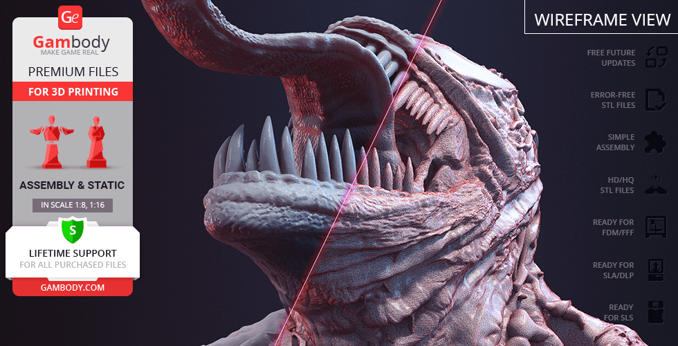 Venom figurine for 3D printing is a static assembly model and its moderation and adaptation for different types of 3D printers took Gambody team 37 hours. Figurine’s anatomy and body proportions were reviewed during the moderation for the muscular symbiote to be depicted harmoniously in the intended pose.