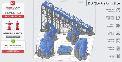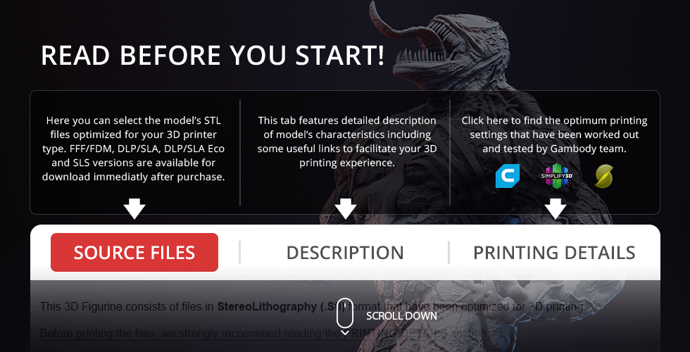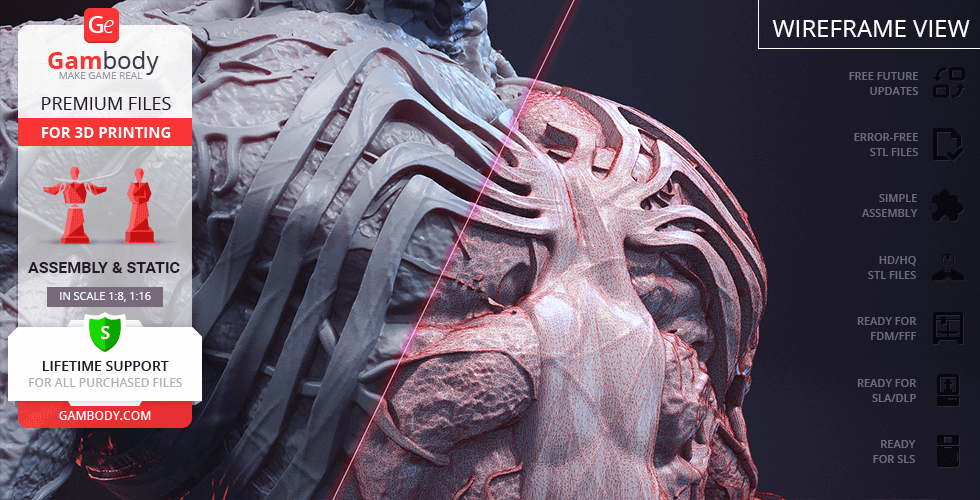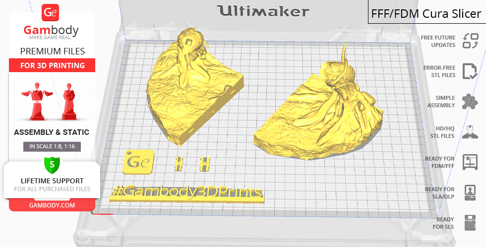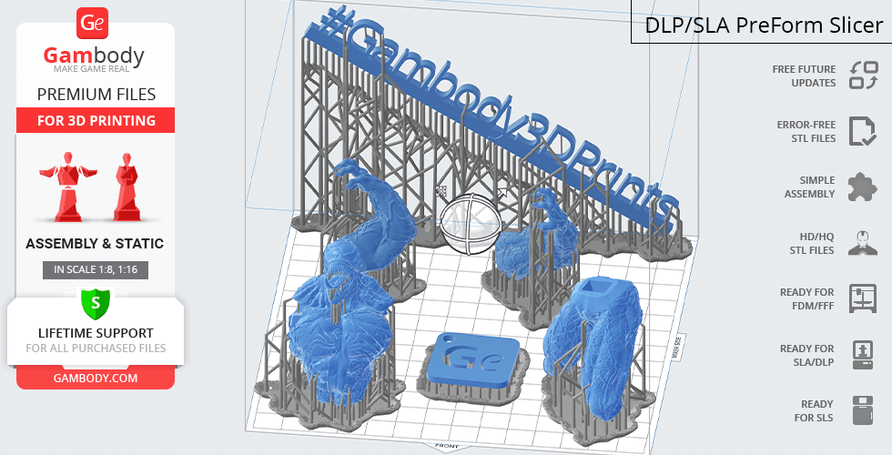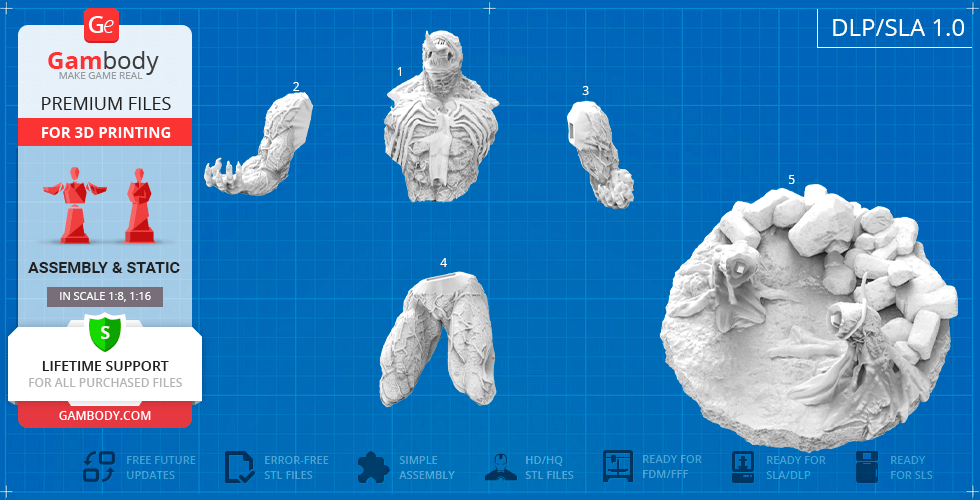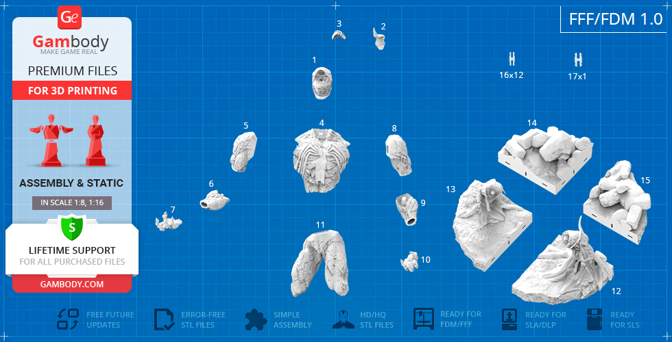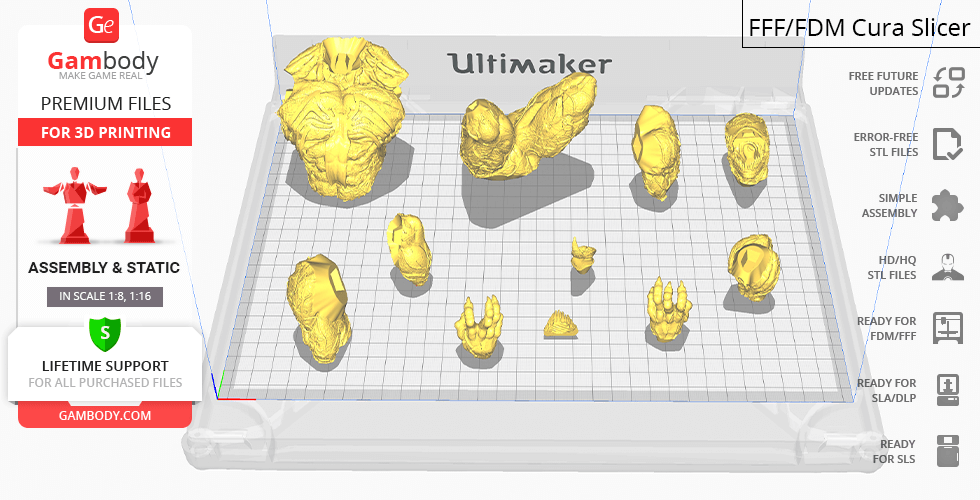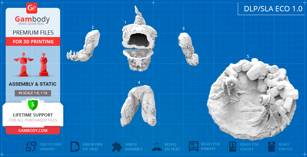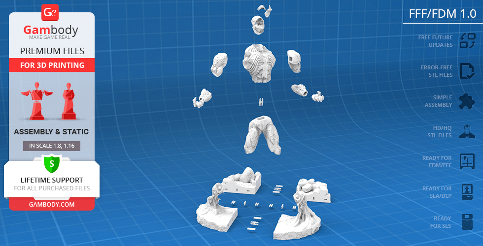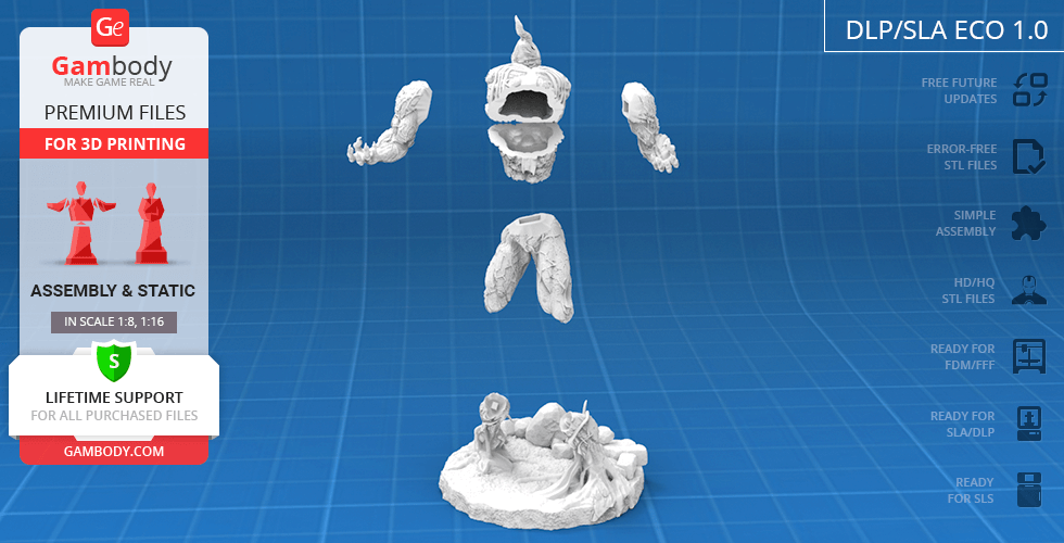 All the assembly parts come in STL files in recommendedpositions that were worked out in order to ensure the smoothness of the details’ surfaces after printing and so that the 3D printing beginners won't face difficulties when placing the parts on a build plate. When downloading any figurine's file you will also receive "Assembly Manual" for FFF/FDM 1.0 and DLP/SLA 1.0 versions in PDF format.