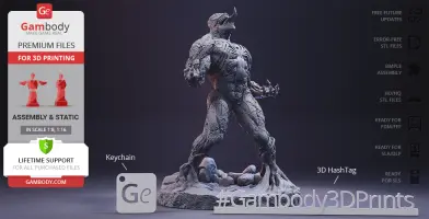 The eerie-grinned Venom has always been ranked high in the fans’ “top” lists and its shape-shifting ability naturally serves as a vivid inspiration for the artists of all kinds. The author of the Venom figurine for 3D printing captured the parasite in rage. It seems that the 3D printing scene unfolds at the very end of the bonding process - the model's legs are still partially engulfed by the viscous substance that the Venom is. The figurine exposes its non-human fanged jaws, a long tongue and protruding claws, while the large Spider-Man logo adorns the chest of the alien symbiote.