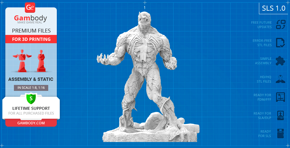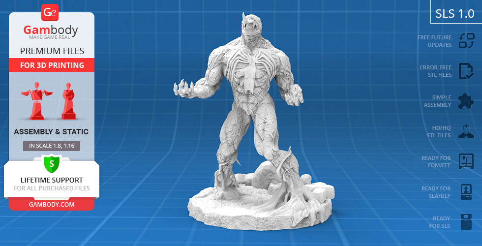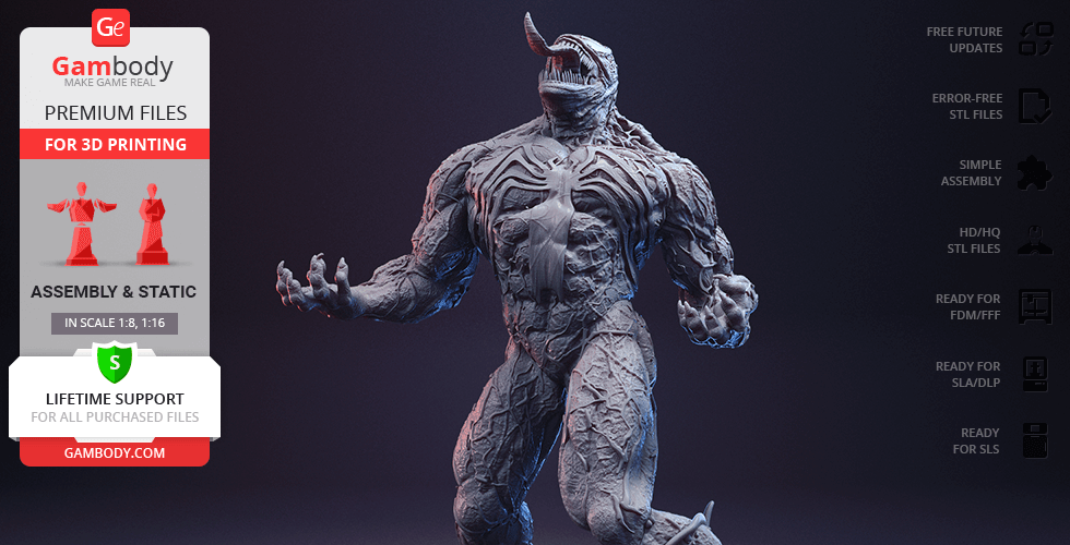 SLS 1.0 version features:- Made as a solid one-piece Venom figurine;- A printed model is 130 mm tall, 103 mm wide, 100 mm deep.