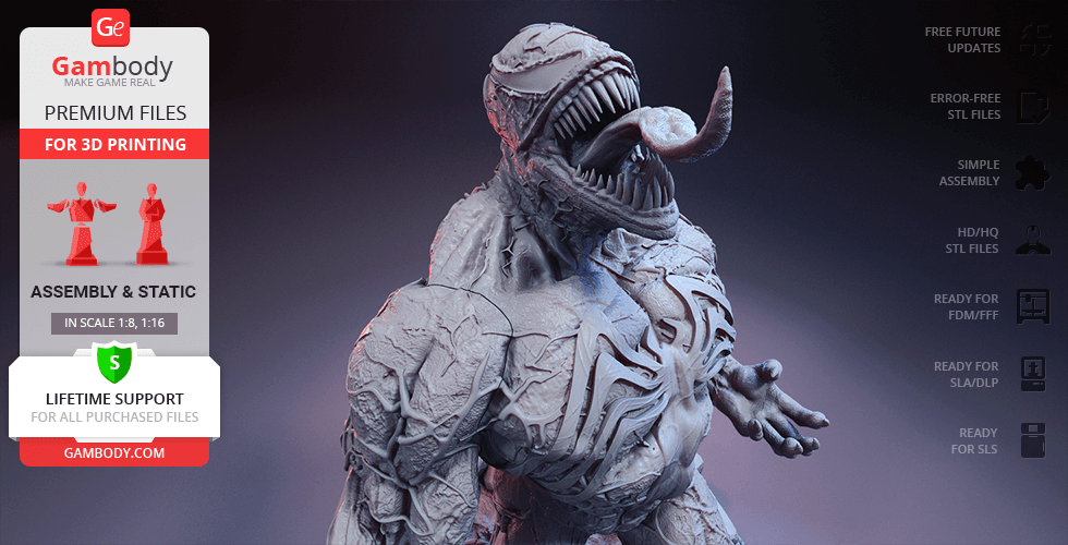 - 4 versions of Venom STL files for FFF/FDM, DLP/SLA, DLP/SLA Eco, and SLS - files for each version are available for download after the purchase