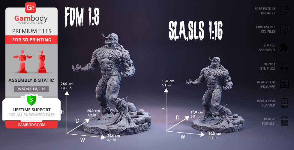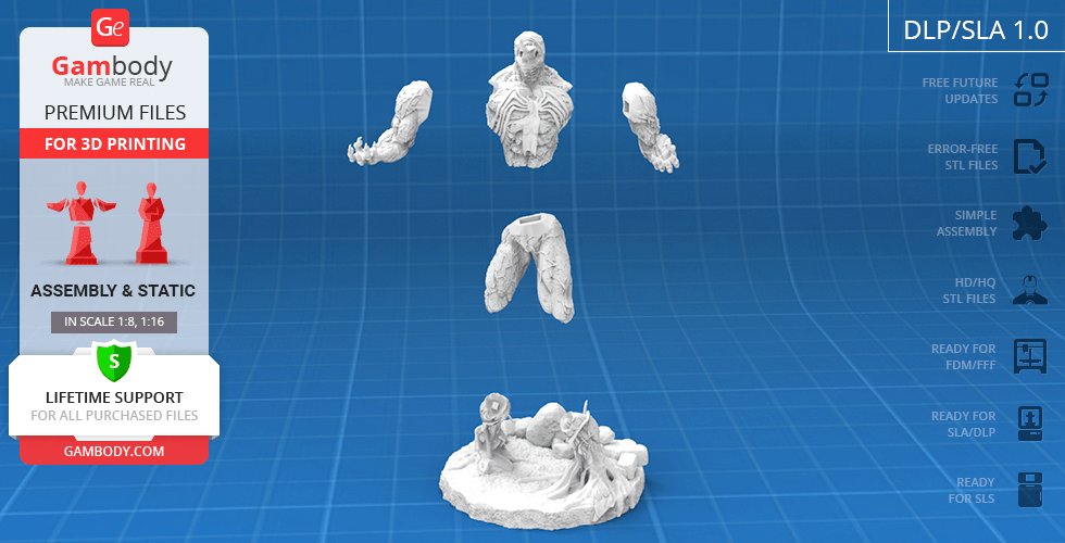The model's scale was calculated from Venom's actual height which is 1910 mm. The 3D printing figurine's chosen scale is 1:8 for the FFF/FDM version and 1:16 for the DLP/SLA/SLS versions.