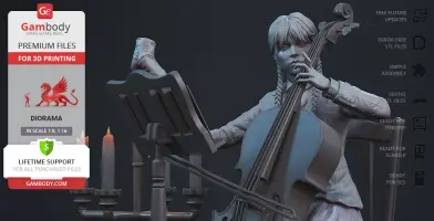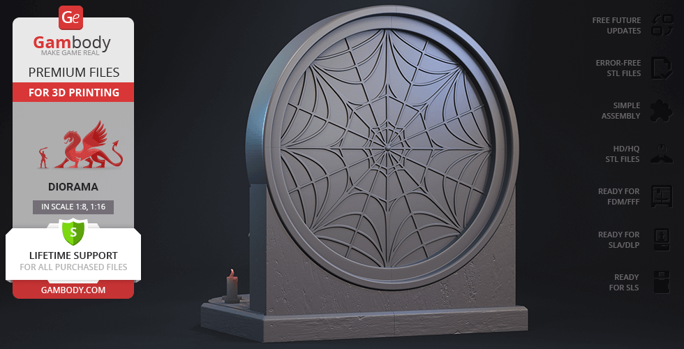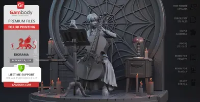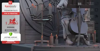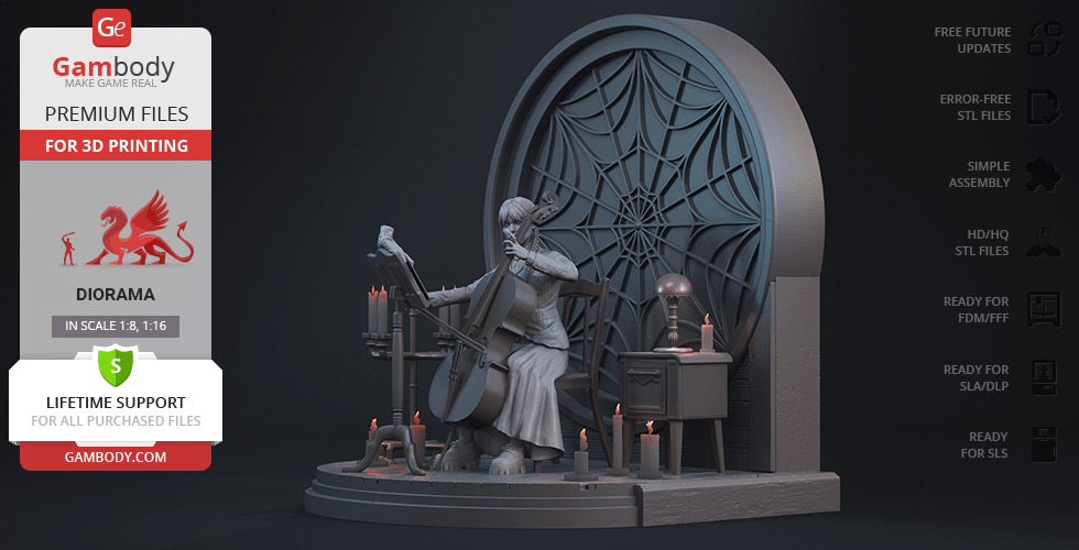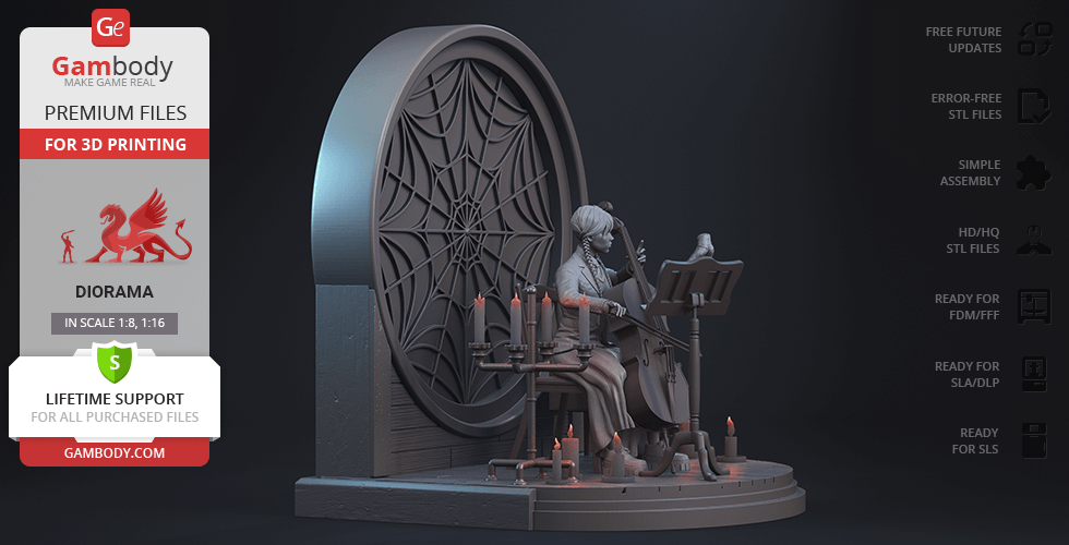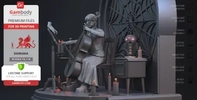Inspired by Tim Butron's "Wednesday" supernatural comedy horror, our contributive 3D artist created this atmospheric 3D print model. Following the scene of the first episode, Wednesday is depicted playing the cello. The giant web behind her was copied from the stained-glass window in the movie and we really like the seclusion it creates. It is amplified by the candles in candelabras and on the floor. This diorama can become a great gift for your children or friends, it can also perfectly complement your own collection!