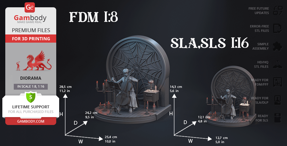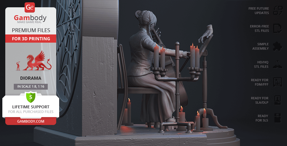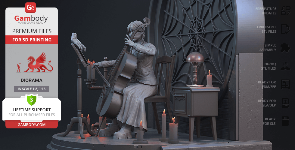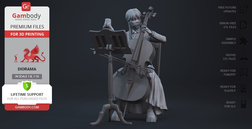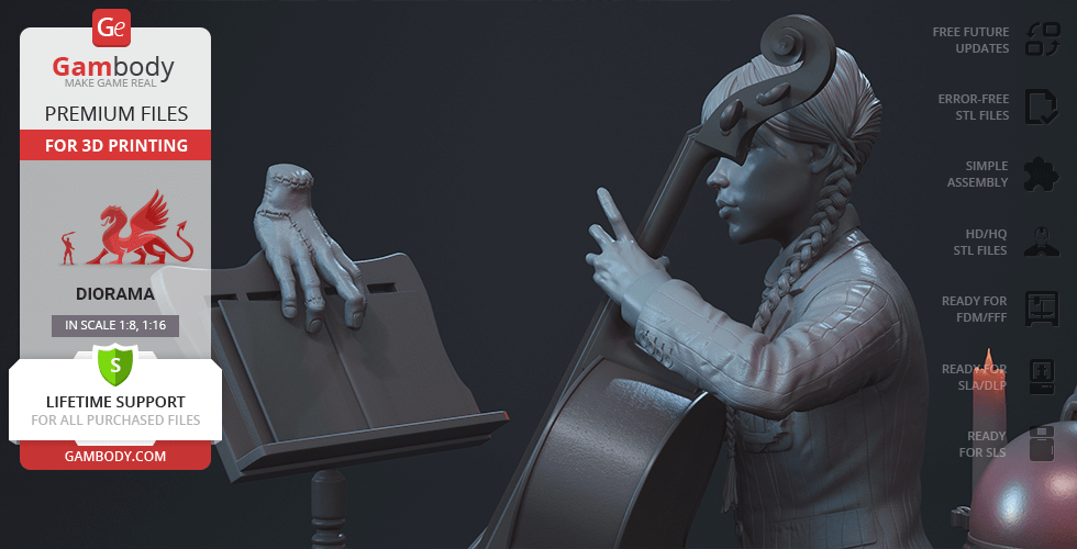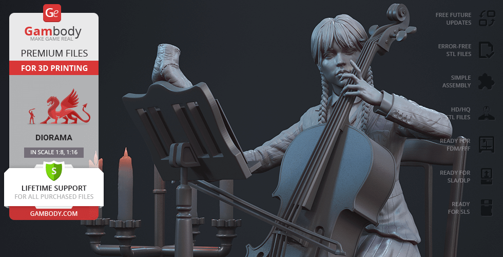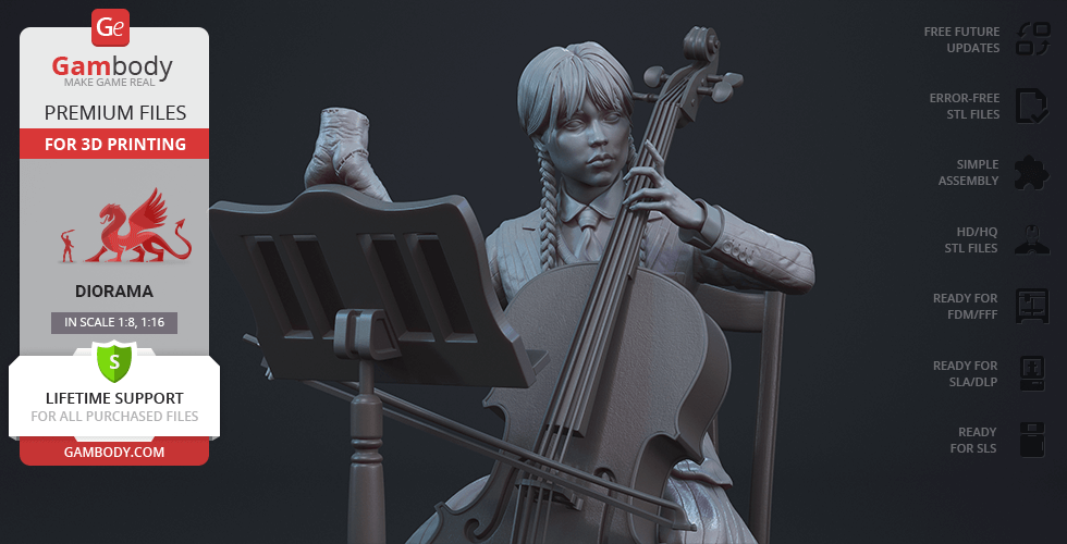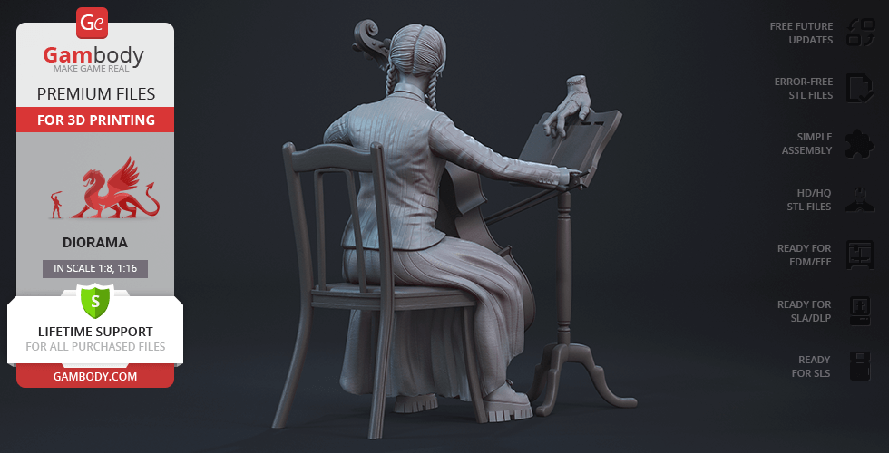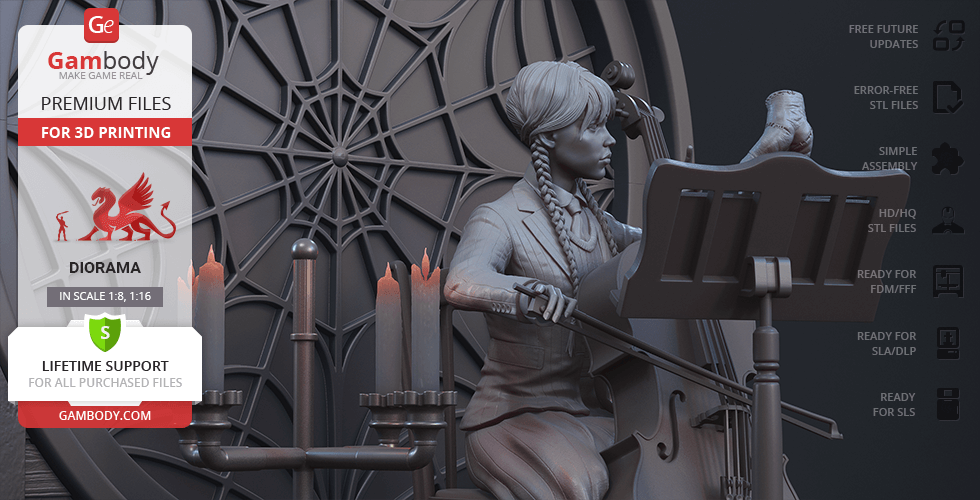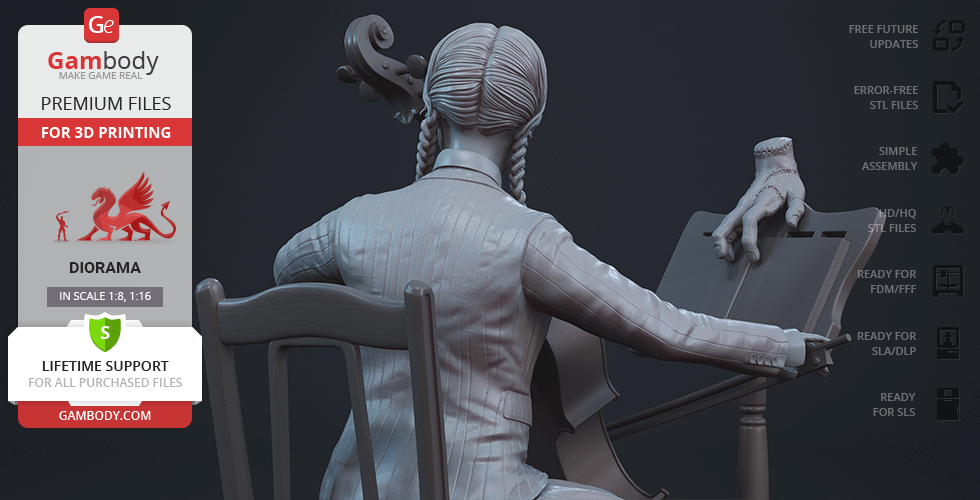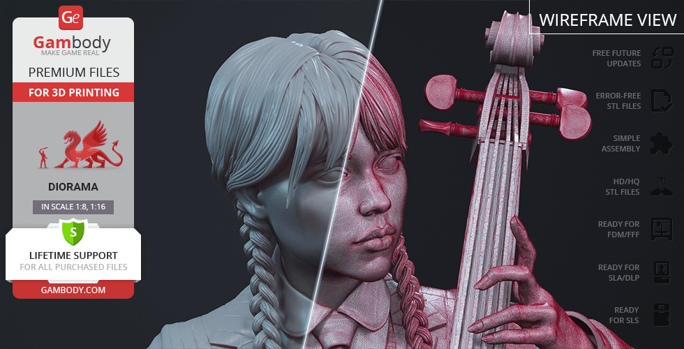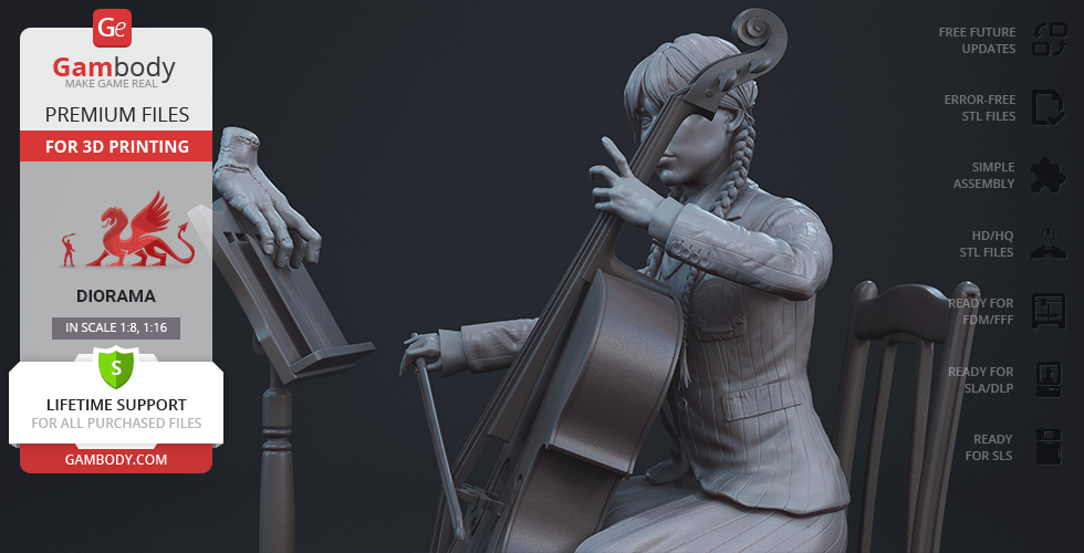- 4 versions of Wednesday in Diorama STL files for FFF/FDM, DLP/SLA, DLP/SLA Eco, and SLS — files for all versions are available for download after the purchase;