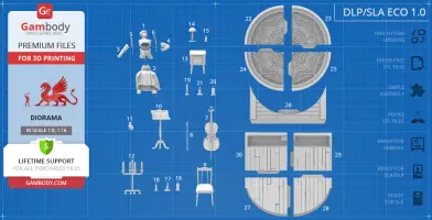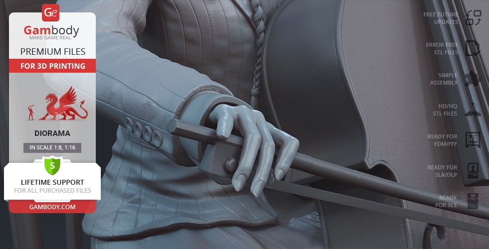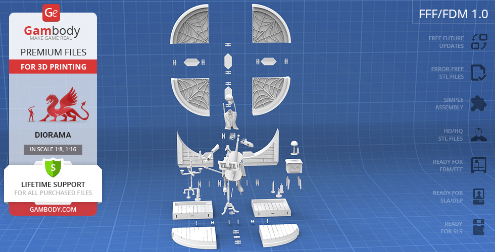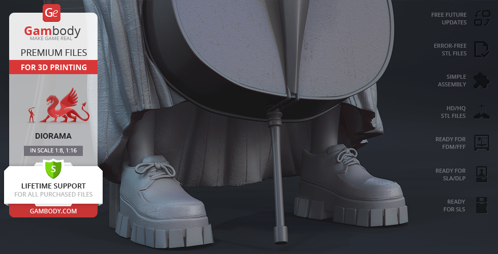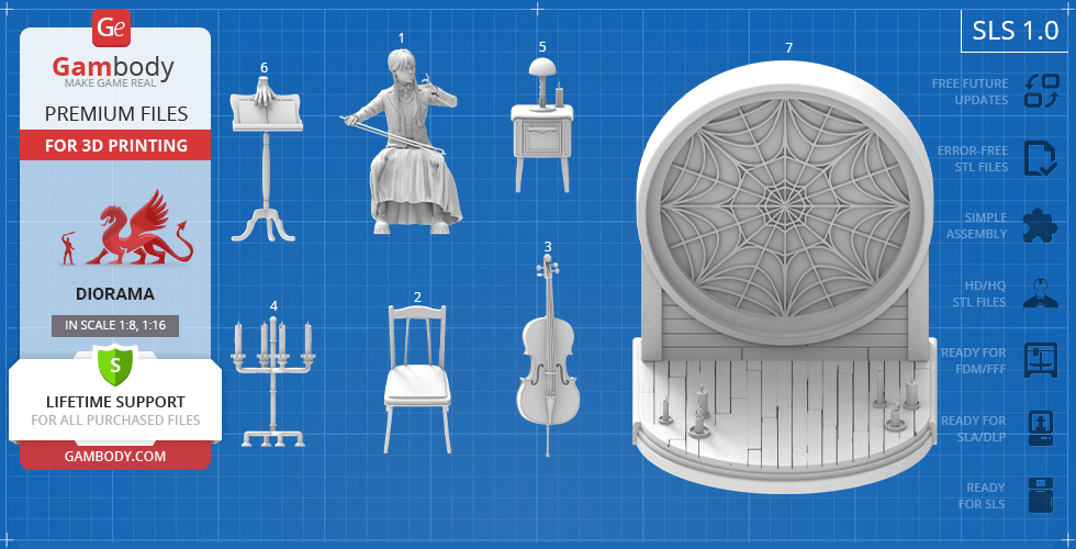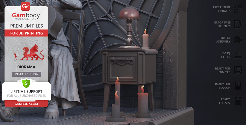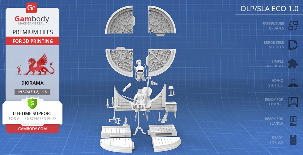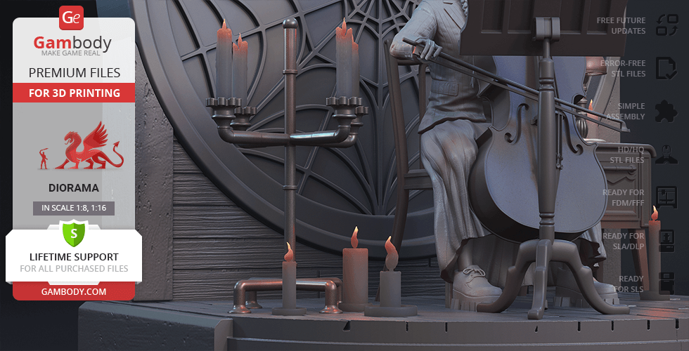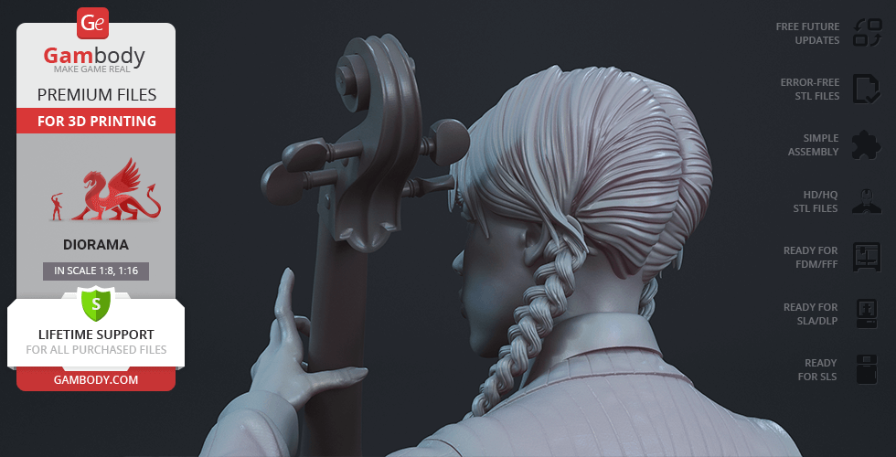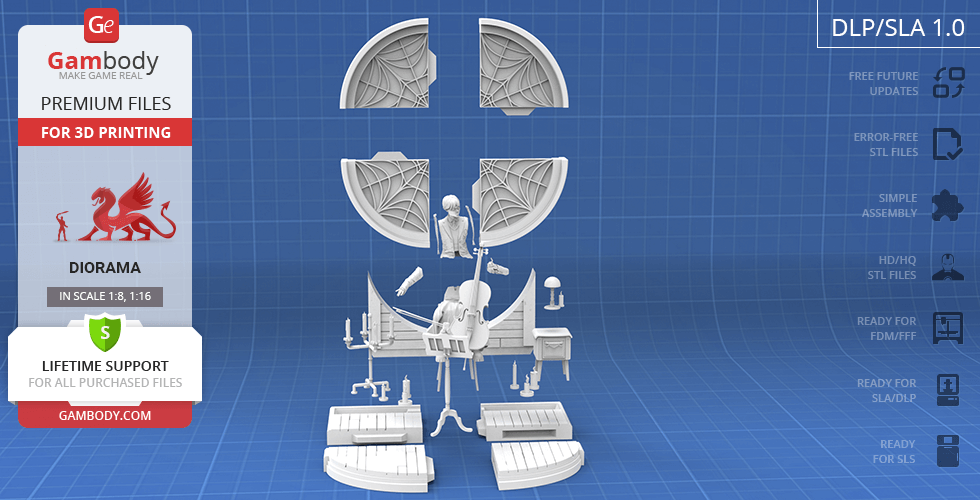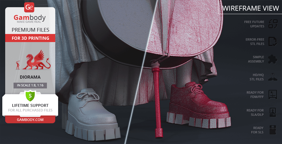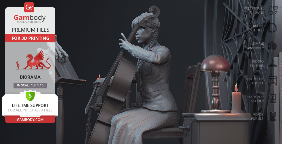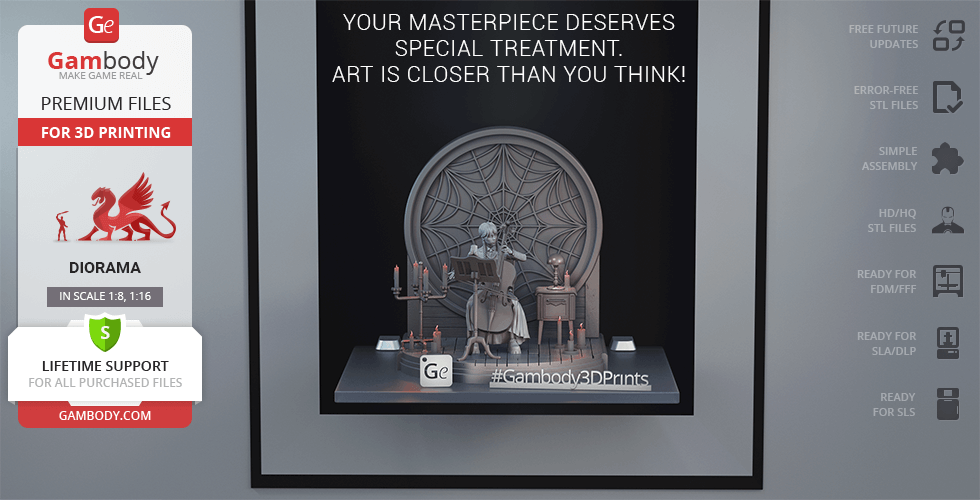 - 4 versions of Wednesday in Diorama STL files for FFF/FDM, DLP/SLA, DLP/SLA Eco, and SLS — files for all versions are available for download after the purchase;
