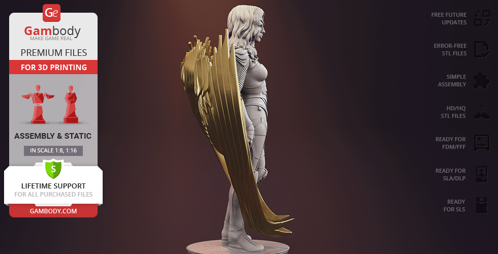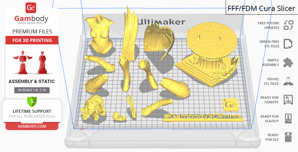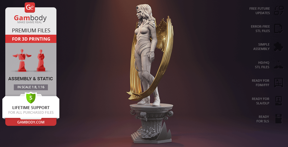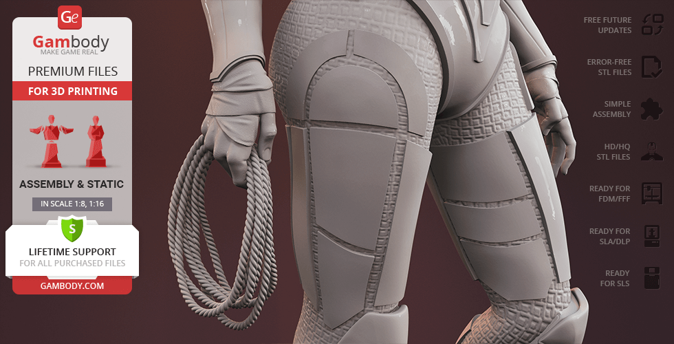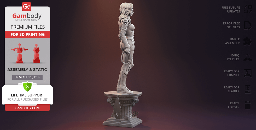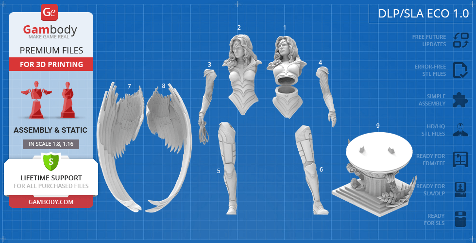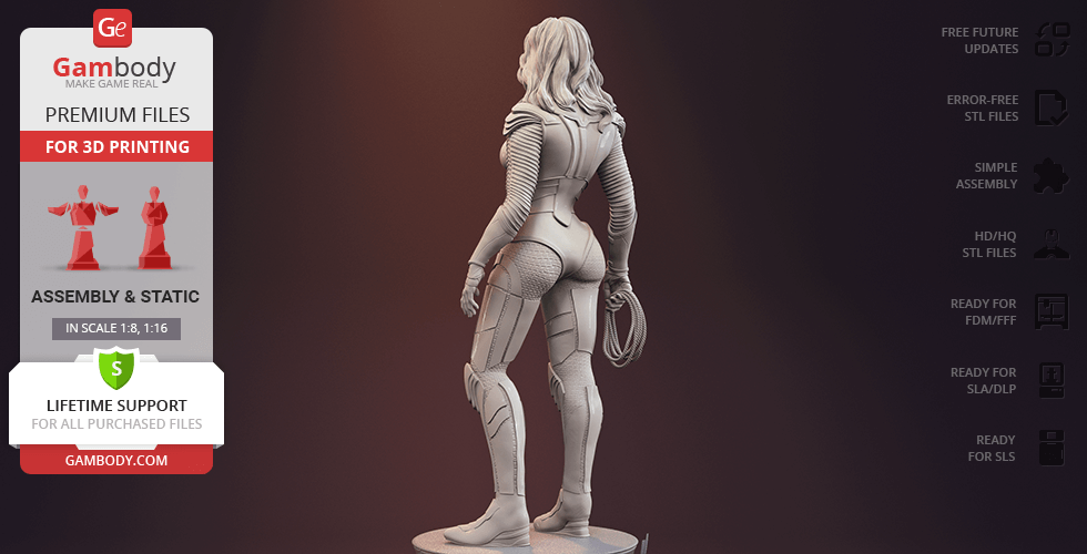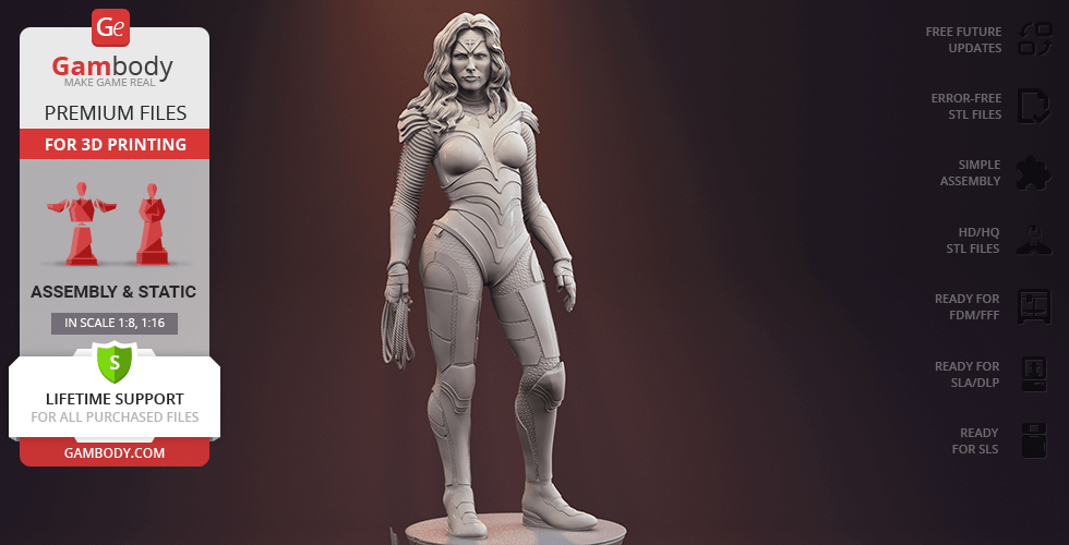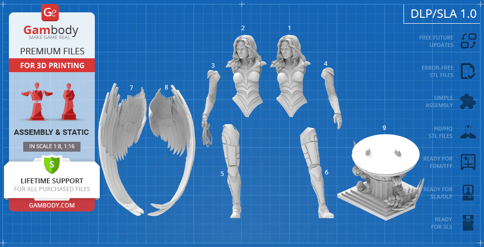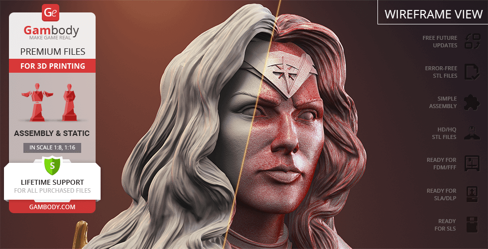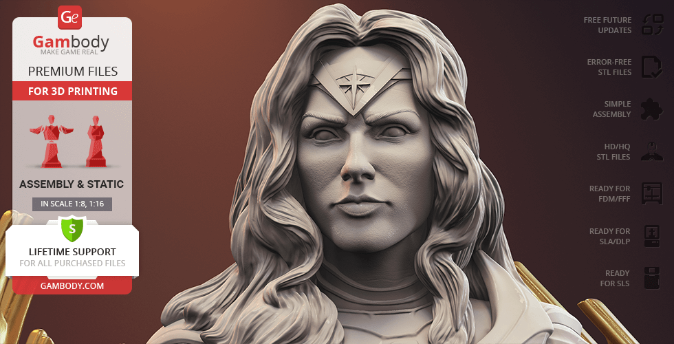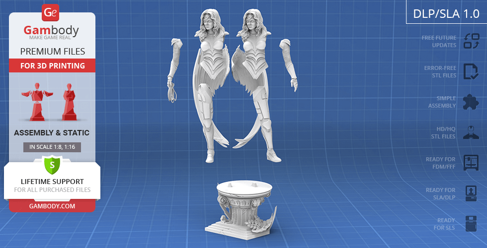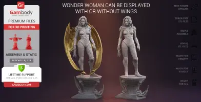 - The model is available in recommended scales of 1:8 for the FFF/FDM version and 1:16 for the DLP/SLA/SLS versions, based on the height of Wonder Woman.