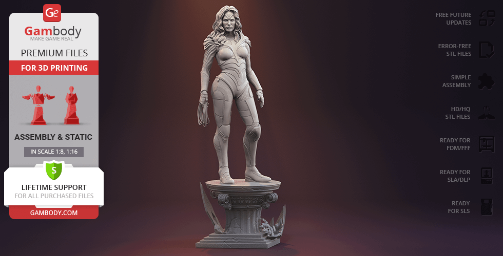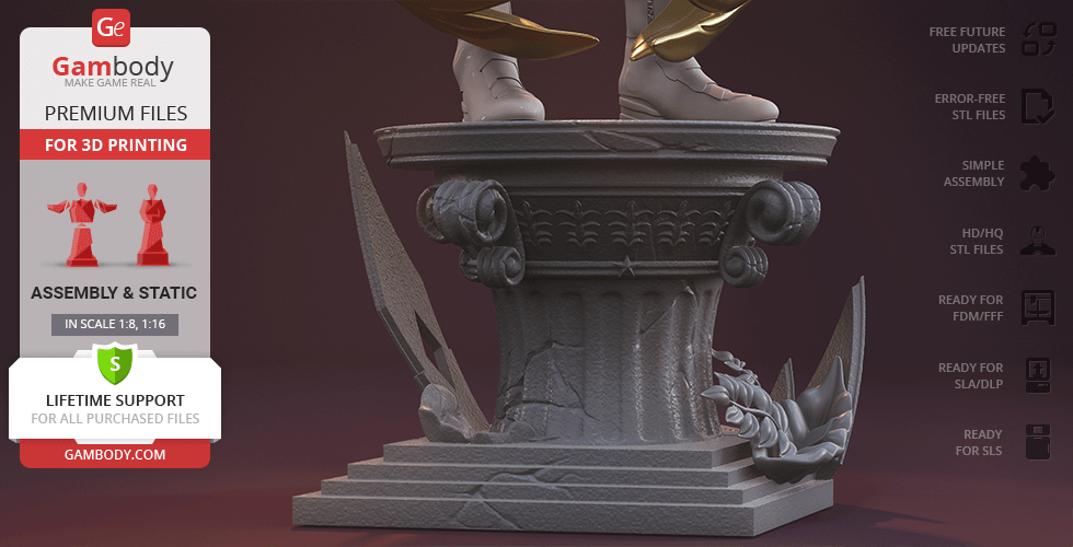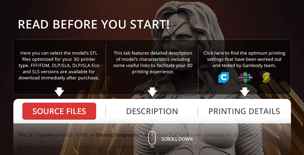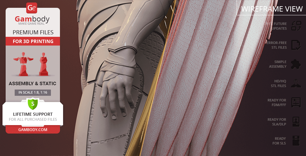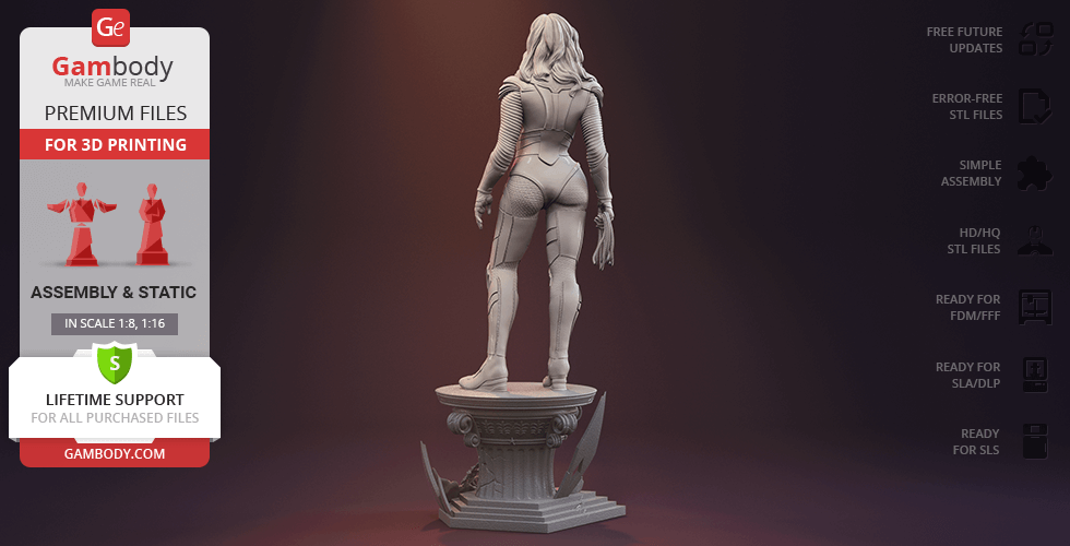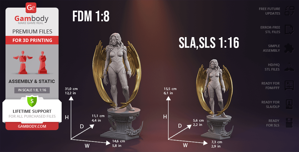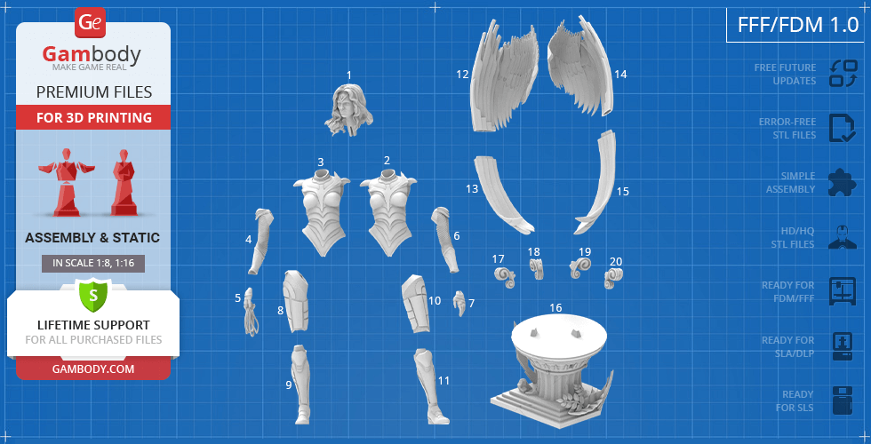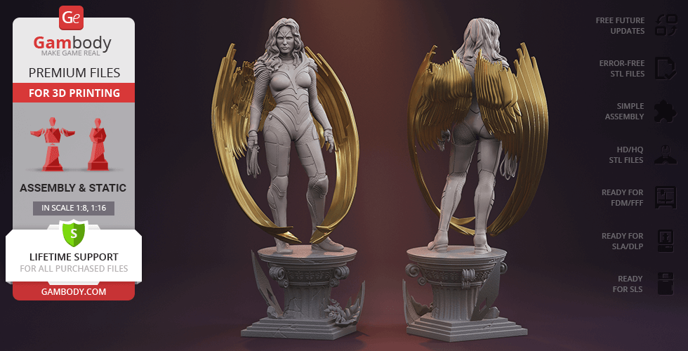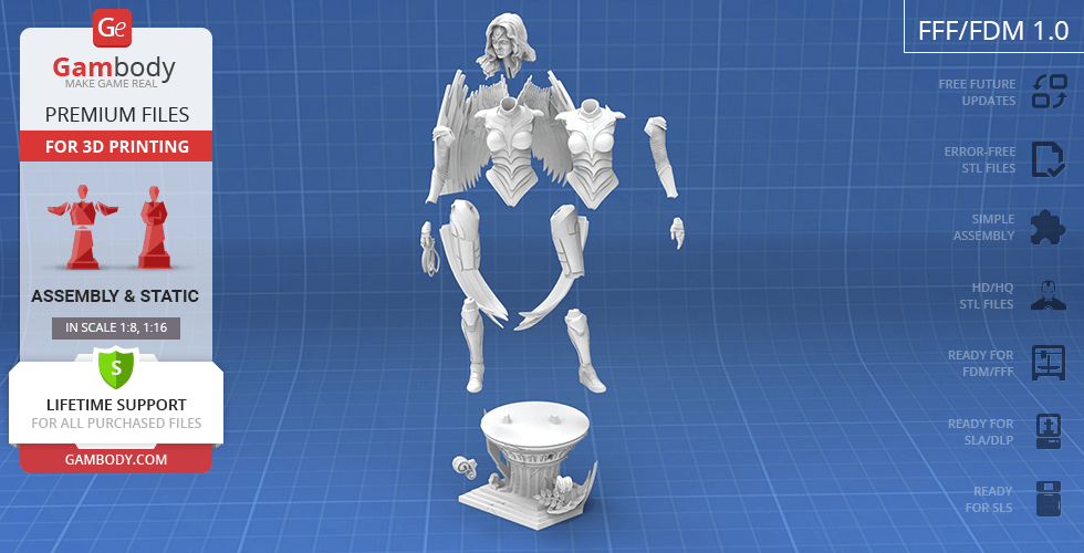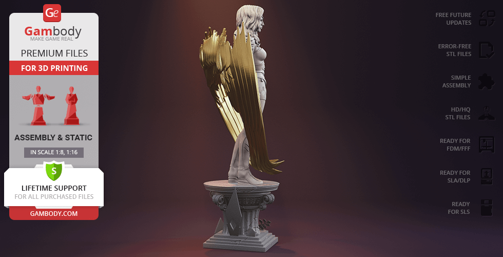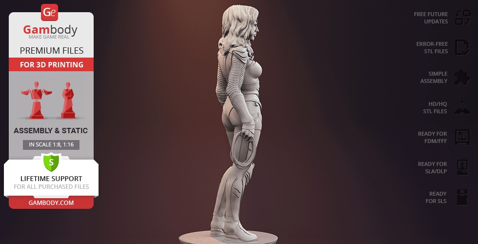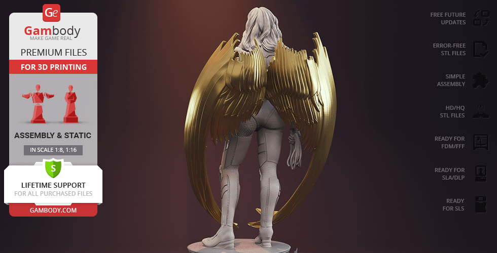 - The model is available in recommended scales of 1:8 for the FFF/FDM version and 1:16 for the DLP/SLA/SLS versions, based on the height of Wonder Woman.