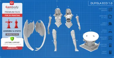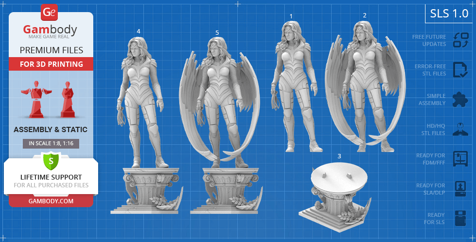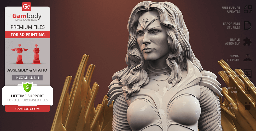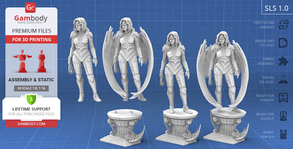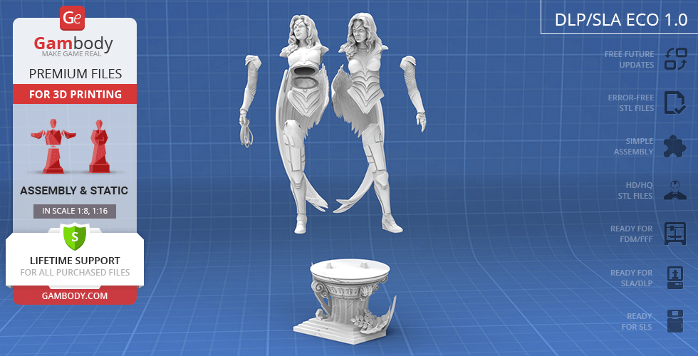 - 4 versions of Wonder Woman 1984 STL files for FFF/FDM, DLP/SLA, DLP/SLA Eco, and SLS — files for all versions are available for download after the purchase;