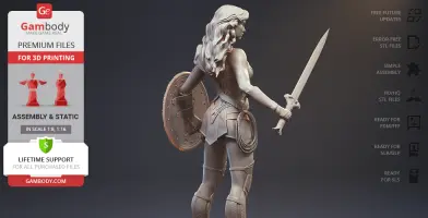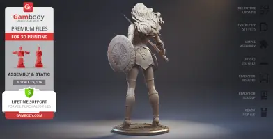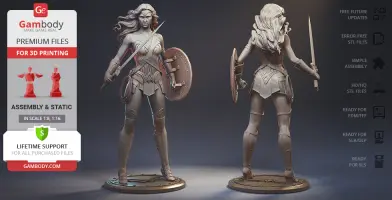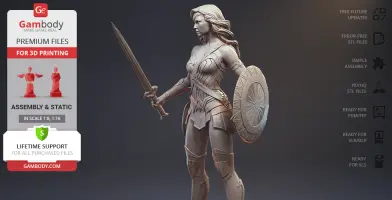 Wonder Woman figurine for 3D printing is a static assembly model and its moderation and adaptation for different types of 3D printers took Gambody team 48 hours. The figurine’s anatomy and proportions were thoroughly reviewed during the moderation process for the Princess Diana of Themyscira to be depicted harmoniously in the intended pose.