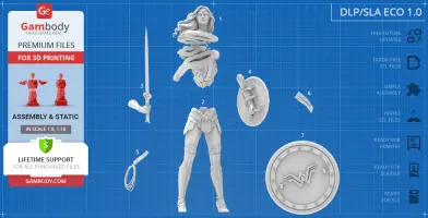 DLP/SLA Eco 1.0 version features:- Contains 7 parts;- A printed model is 117 mm tall, 57 mm wide, 78 mm deep;- The figurine comes with a base that has a Wonder Woman logo on it;- Contains some hollowed out parts to save resin.