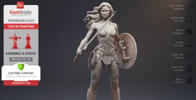 FFF/FDM 1.0 version features:- Contains 15 parts;- A printed model is 233 mm tall, 115 mm wide, 157 mm deep;- The figurine comes with a base that has a Wonder Woman logo on it;- All parts are divided in such a way that you will print them with the smallest number of support structures.