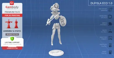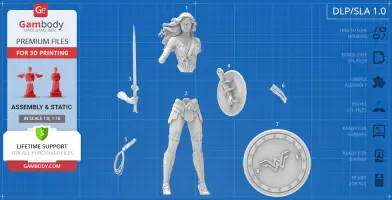 DLP/SLA 1.0 version features:- Contains 7 parts;- A printed model is 117 mm tall, 57 mm wide, 78 mm deep;- The figurine comes with a base that has a Wonder Woman logo on it;- All parts are divided in such a way to fit the build plates and to ensure that support structures are generated where needed.