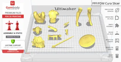 All assembly parts come in STL files of FFF/FDM versions in recommended positions that were worked out in order to ensure the smoothness of the details’ surfaces after printing and so that the 3D printing beginners won't face difficulties when placing the parts on a build plate. When downloading any figurine's file you will also receive "Assembly Manual" for FFF/FDM 1.0 and DLP/SLA 1.0 versions in PDF format.