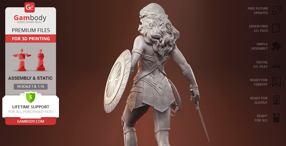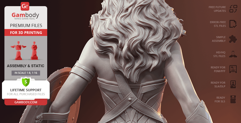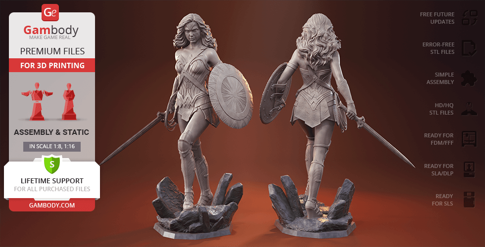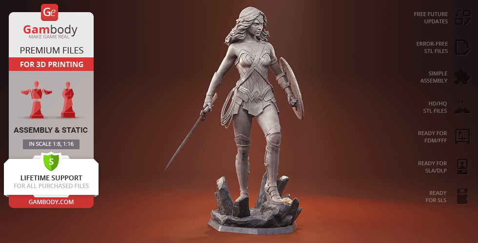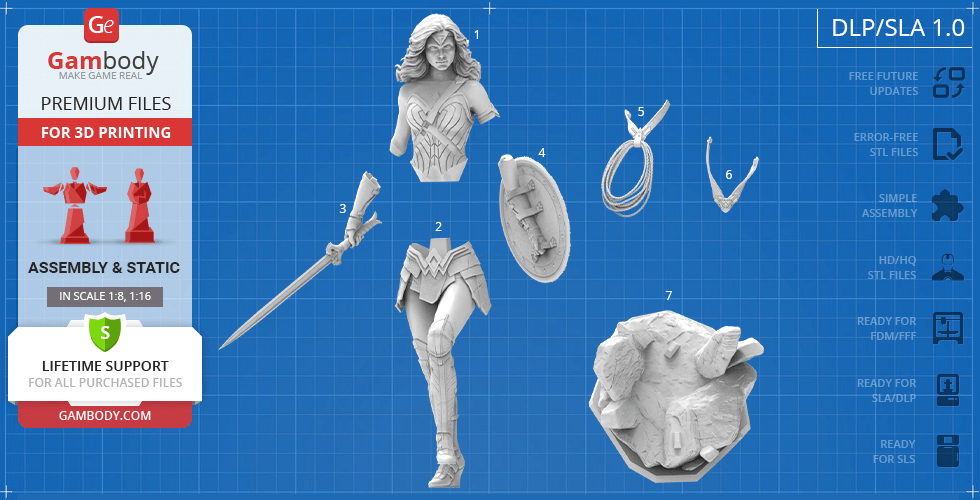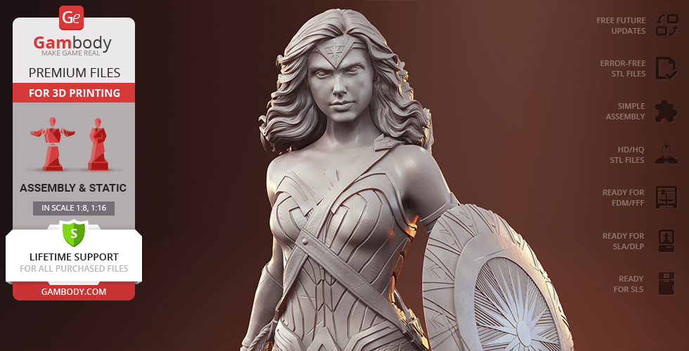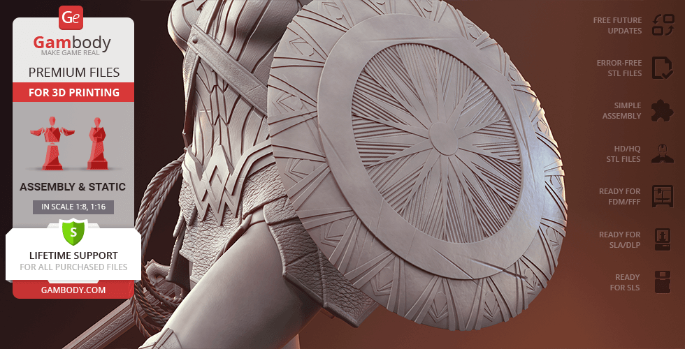 - The model is available in recommended scales of 1:8 for the FFF/FDM version and 1:16 for the DLP/SLA/SLS versions, based on approximate height of Wonder Woman.