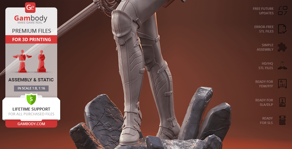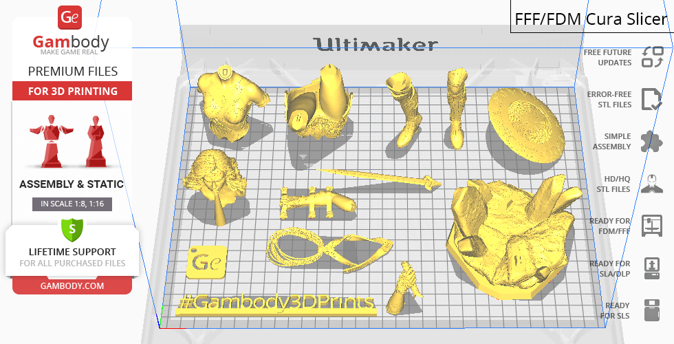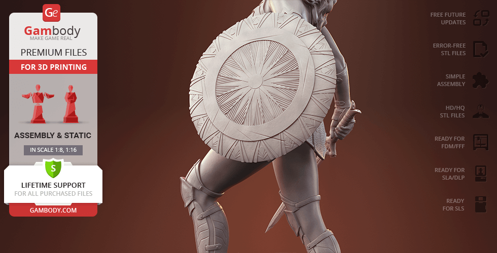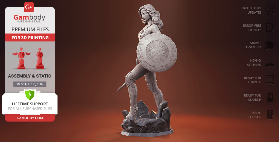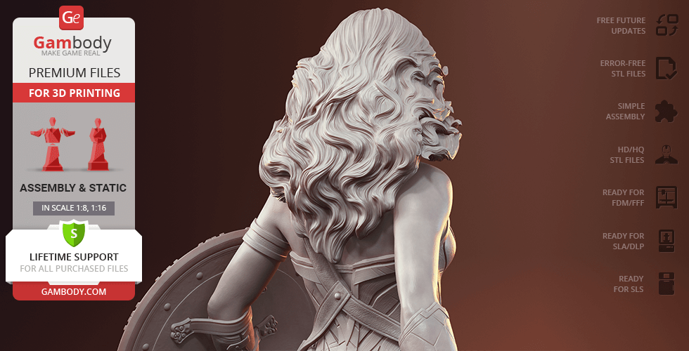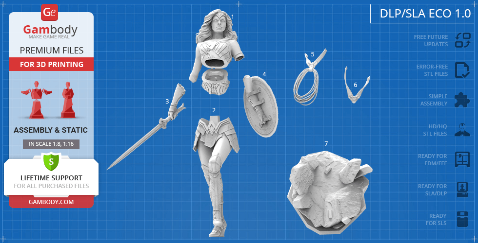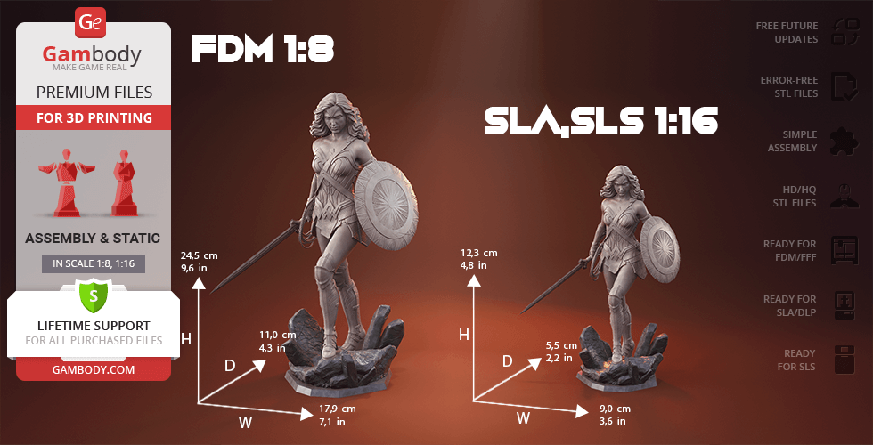 - The model is available in recommended scales of 1:8 for the FFF/FDM version and 1:16 for the DLP/SLA/SLS versions, based on approximate height of Wonder Woman.