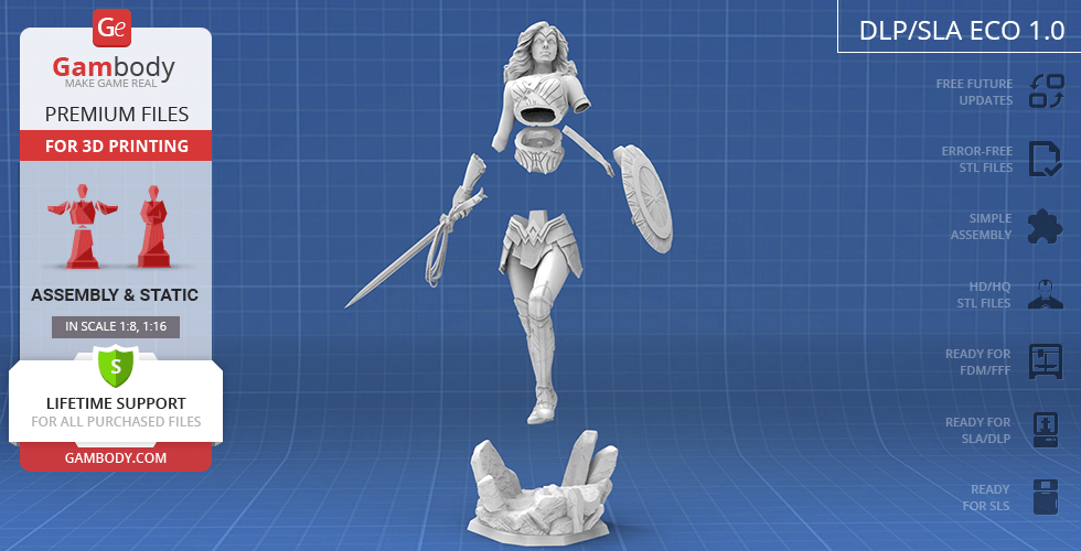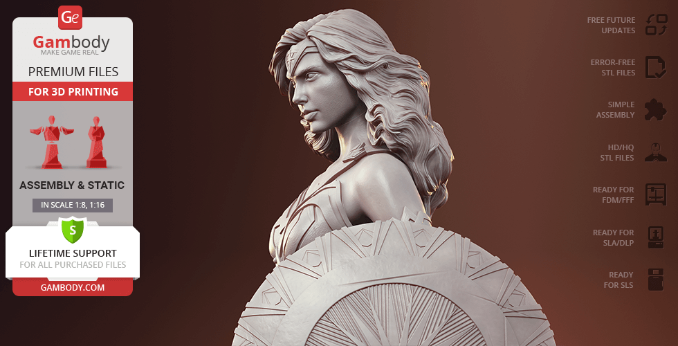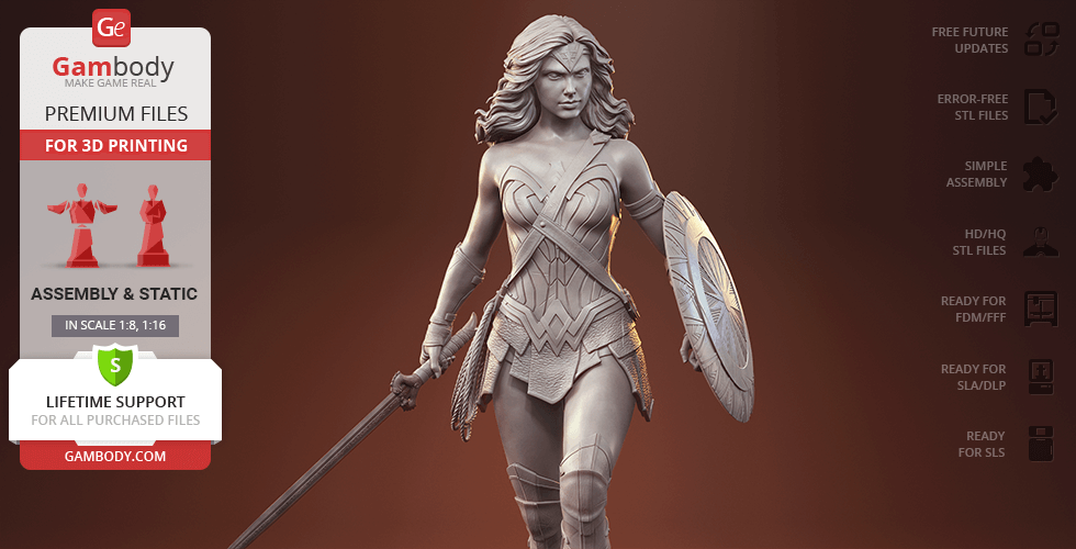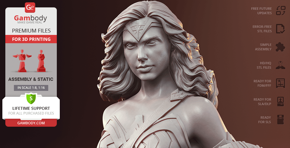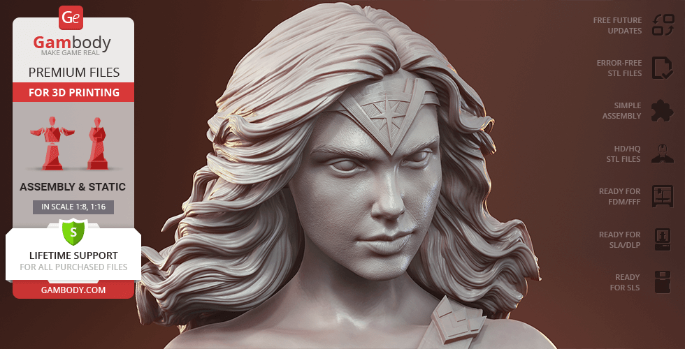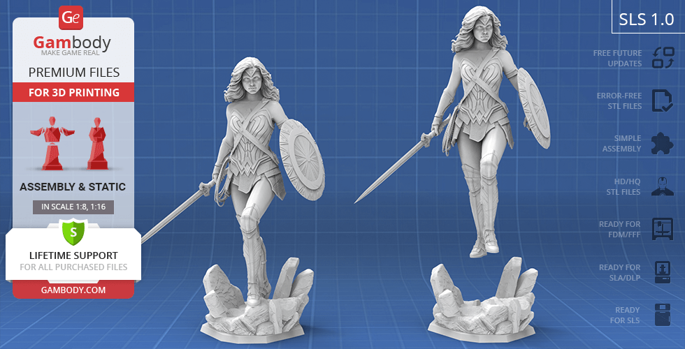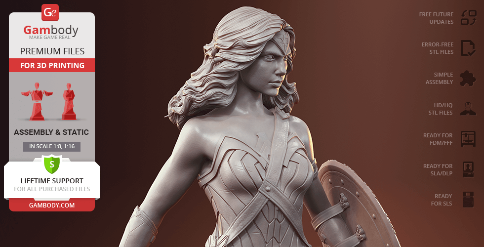 - 4 versions of Wonder Woman STL files for FFF/FDM, DLP/SLA, DLP/SLA Eco, and SLS — files for all versions are available for download after the purchase;
