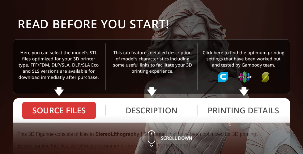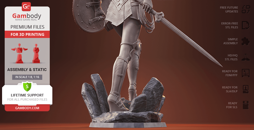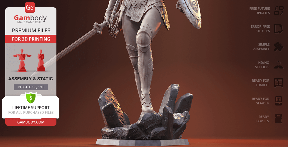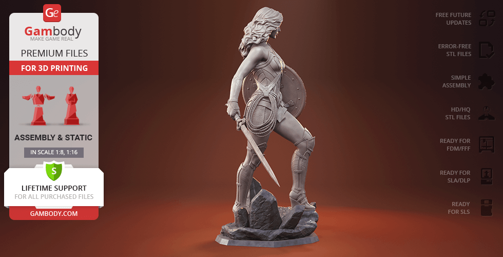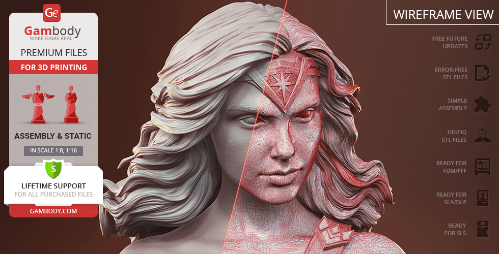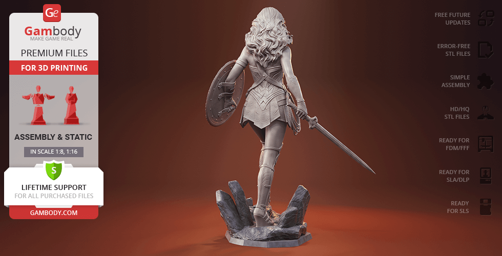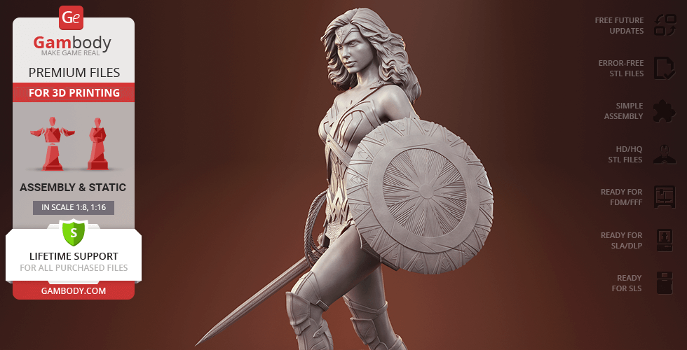 - 4 versions of Wonder Woman STL files for FFF/FDM, DLP/SLA, DLP/SLA Eco, and SLS — files for all versions are available for download after the purchase;