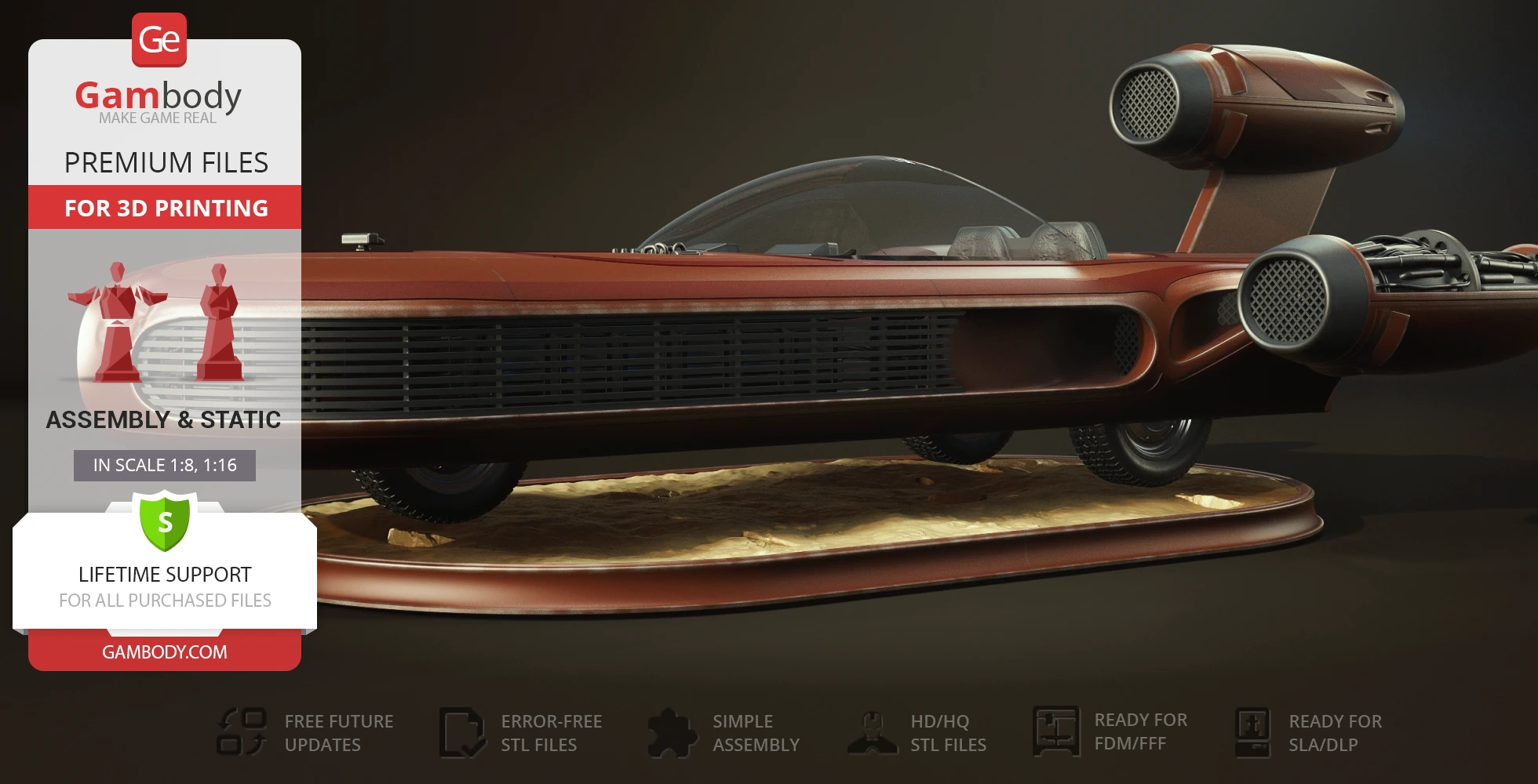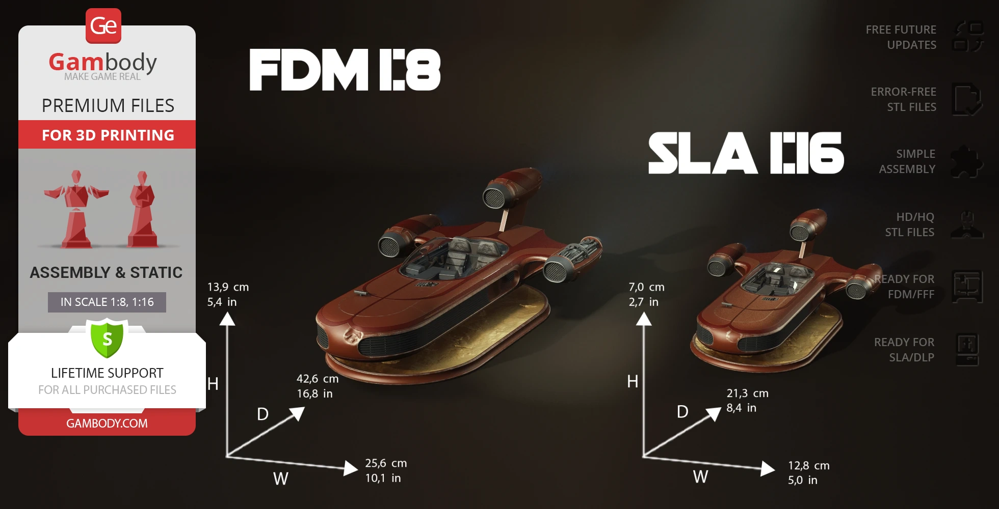 - 2 versions of X-34 Landspeeder STL files for FFF/FDM and DLP/SLA— files for all versions are available for download after the purchase;