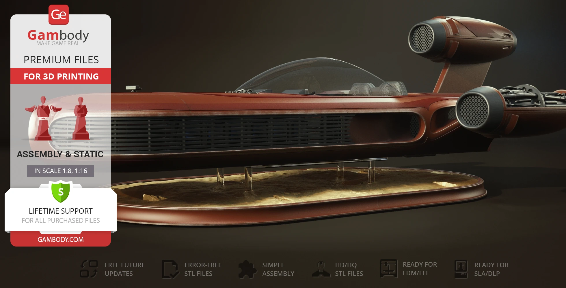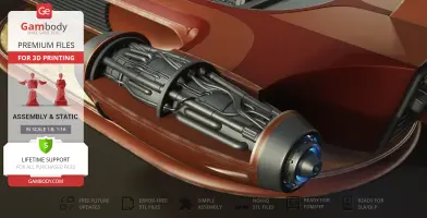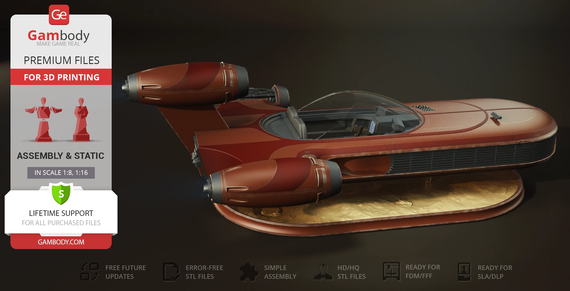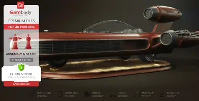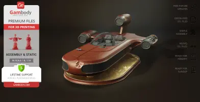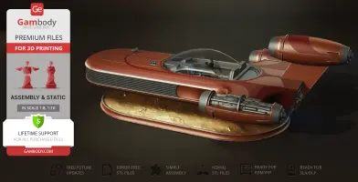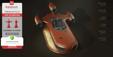 X-34 Landspeeder 3D printing design is a static assembly model and its moderation and adaptation for different types of 3D printers took the Gambody team 86 hours in total.