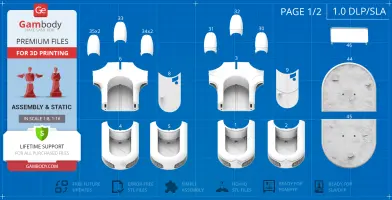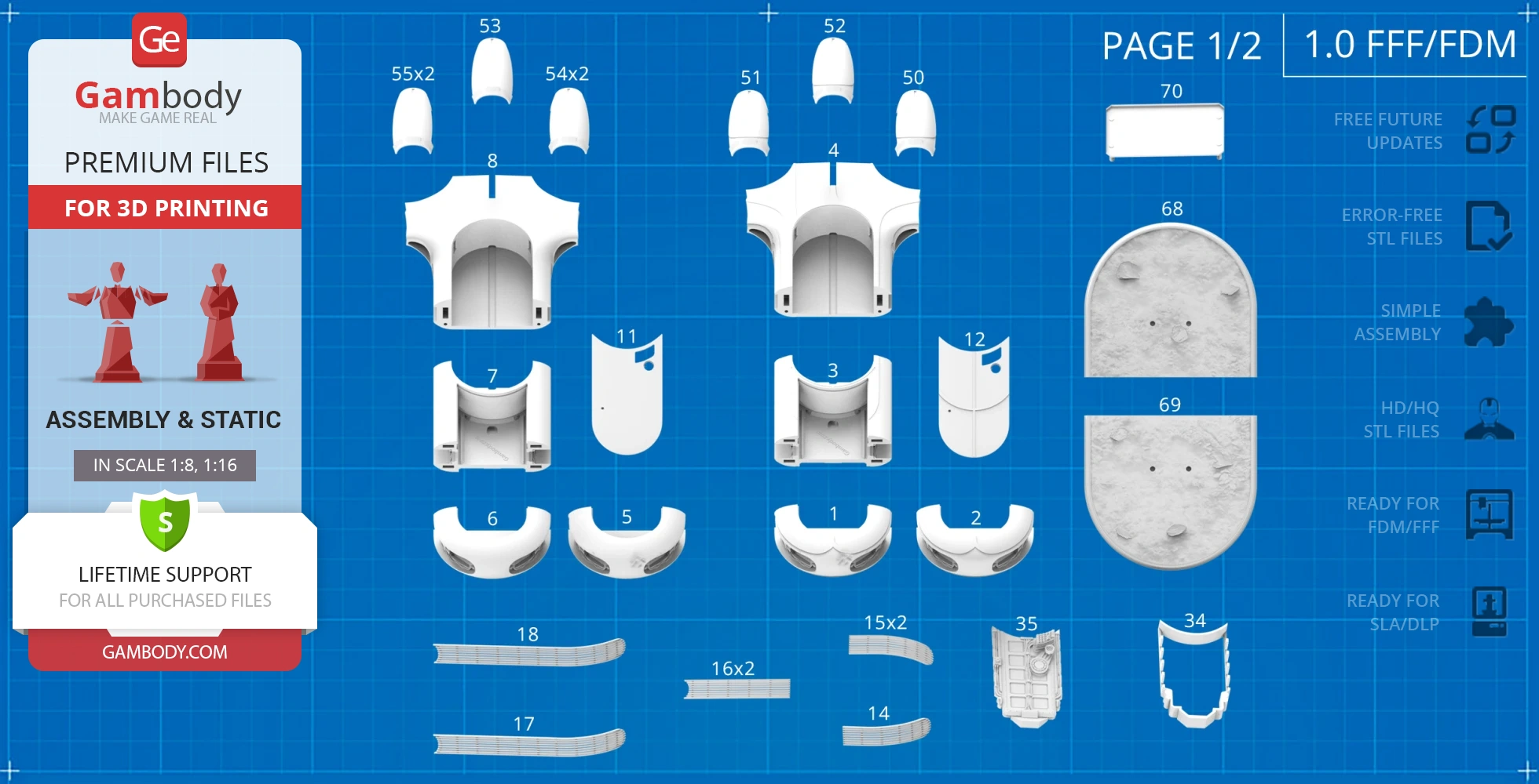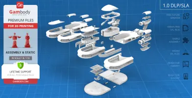 All assembly parts in the 1.0 FFF/FDM version are provided in STL files in recommended positions that were worked out in order to ensure the smoothness of the details’ surfaces after printing and that the 3D printing beginners won’t face difficulties when placing the parts on a build plate. When downloading any model’s file you will also receive “Assembly Manual” for 1.0 FFF/FDM and 1.0 DLP/SLA versions in PDF and video formats. We highly recommend that you get acquainted with the “Assembly Video” and “Assembly Manual” before getting down to the X-34 Landspeeder.