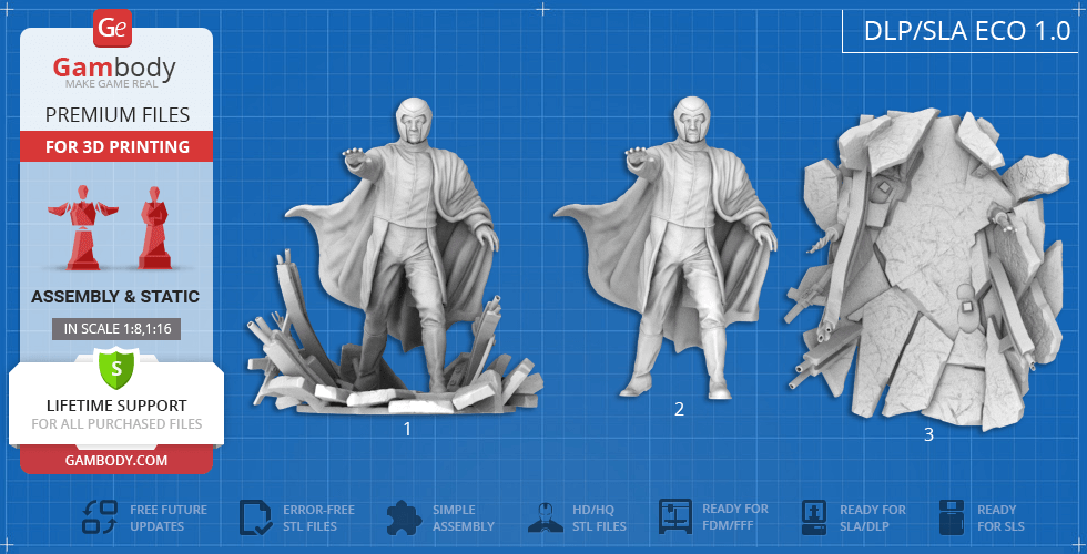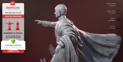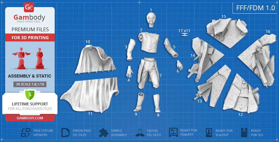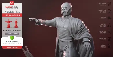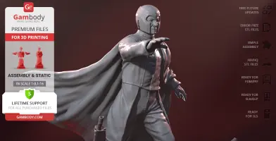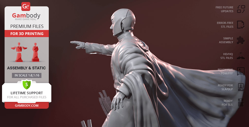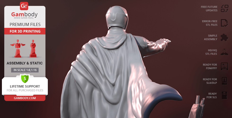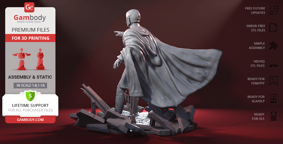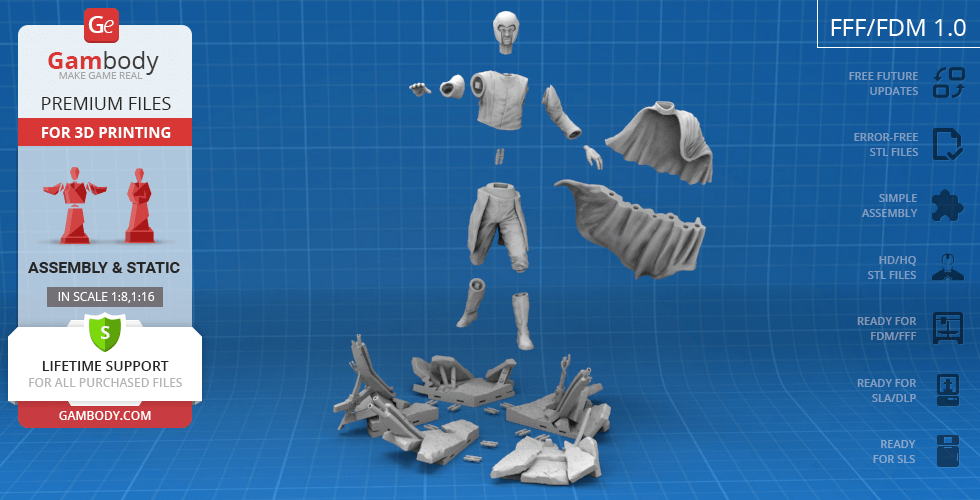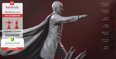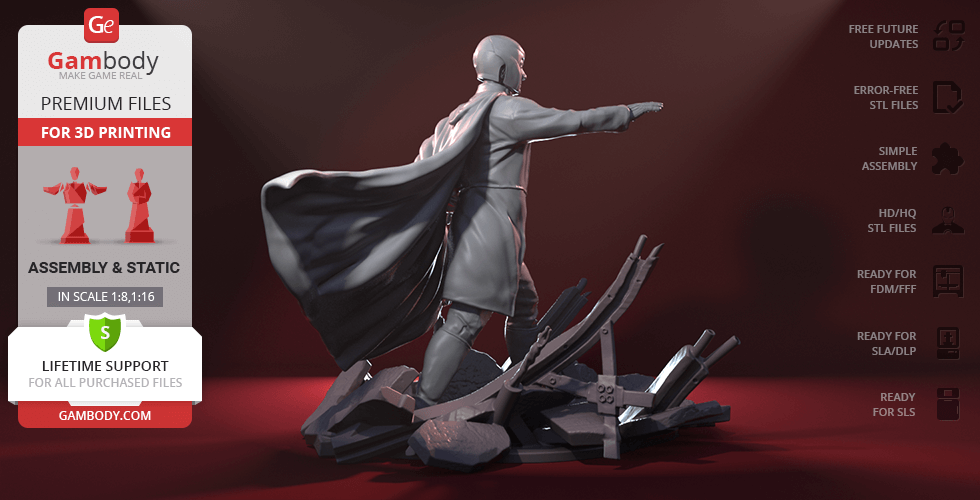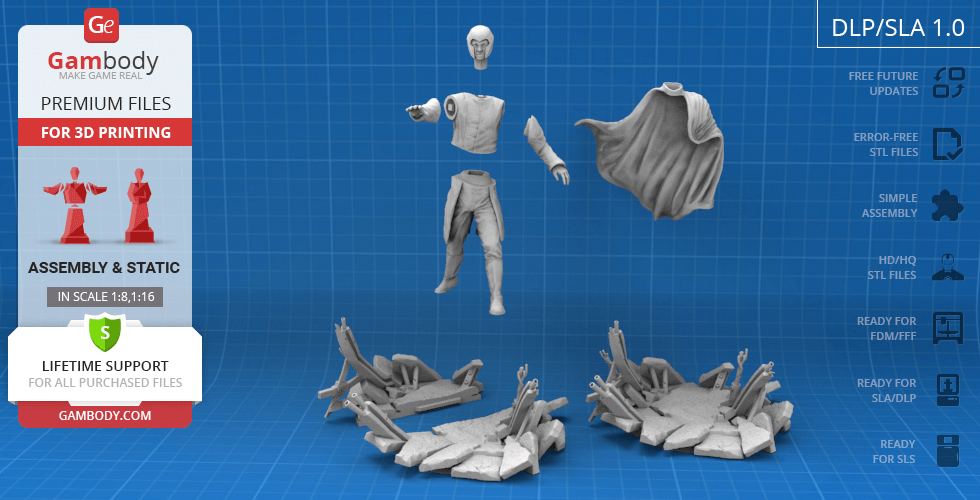 Magneto figurine for 3D printing is a static assembly model and its moderation and adaptation for different types of 3D printers took Gambody team 28 hours in total. The figurine’s anatomy was thoroughly reviewed during the moderation process for Ian McKellen’s character to be depicted harmoniously in the intended pose. The model’s cutting was chosen by our team to minimise the amount of filament needed for generated support and some of the parts were hollowed out for you to save resin. Moreover, in order to conceal the places where assembly parts of the model must be connected, the figurine was cut along the contour of Magneto clothes’ seams. For you to avoid a distinctive cutting line across the figurine's tunic that has the sides extended down, Gambody team added a neat seam to conceal it after assembly. The figurine's platform that resembles the wreckage of the Golden Gate Bridge is divided into 5 separate parts to fit even the smallest 3D printers’ build plates. Magneto's cape that is an integral part of the figurine was ‘taken off’ and split in half as well to ensure nice printing result and is attached to the figurine only by Magneto's head. All the assembly parts are provided in STL files in recommended positions that were worked out so to ensure the smoothness of the details’ surfaces after printing and that the 3D printing beginners won't face difficulties when placing the parts on a build plate.