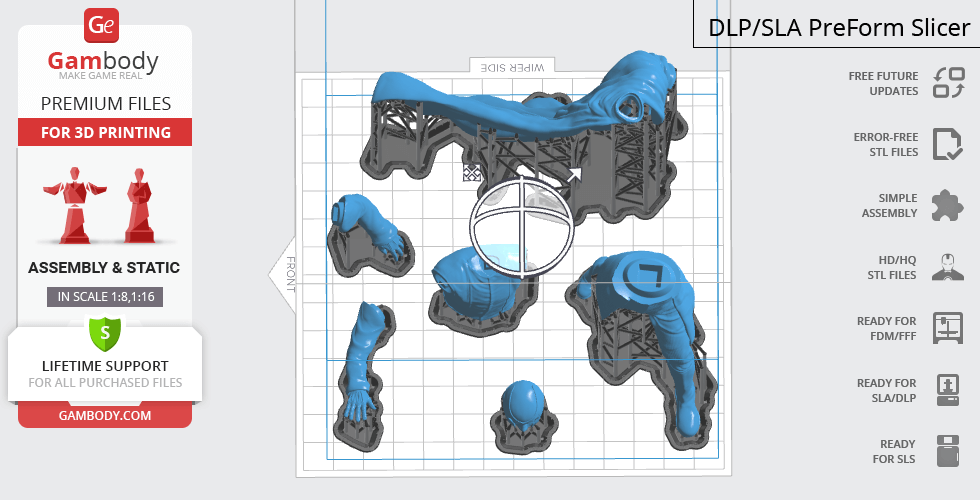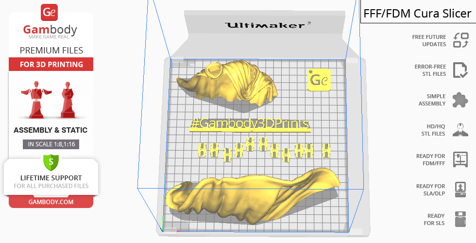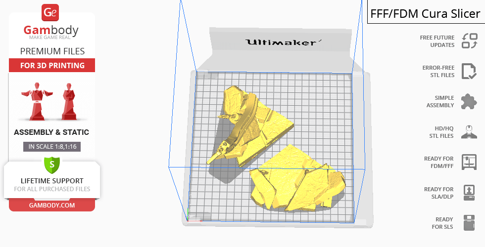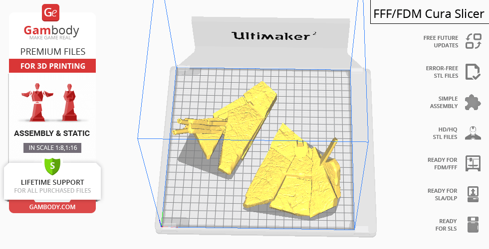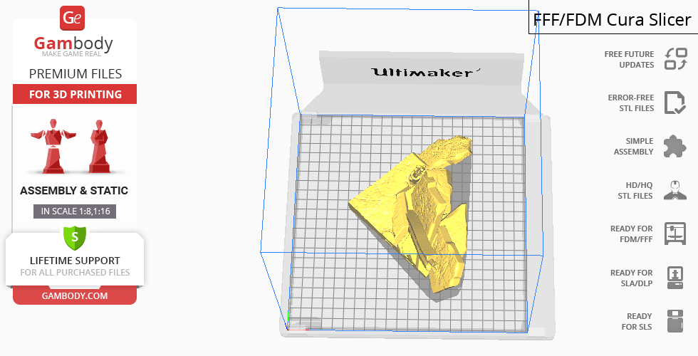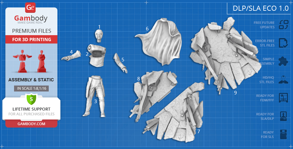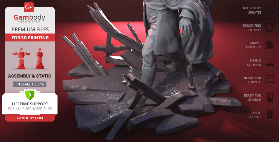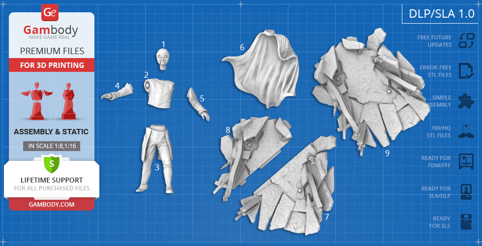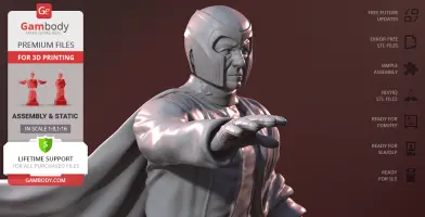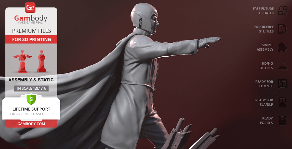 Magneto figurine for 3D printing is a static assembly model and its moderation and adaptation for different types of 3D printers took Gambody team 28 hours in total. The figurine’s anatomy was thoroughly reviewed during the moderation process for Ian McKellen’s character to be depicted harmoniously in the intended pose. The model’s cutting was chosen by our team to minimise the amount of filament needed for generated support and some of the parts were hollowed out for you to save resin. Moreover, in order to conceal the places where assembly parts of the model must be connected, the figurine was cut along the contour of Magneto clothes’ seams. For you to avoid a distinctive cutting line across the figurine's tunic that has the sides extended down, Gambody team added a neat seam to conceal it after assembly. The figurine's platform that resembles the wreckage of the Golden Gate Bridge is divided into 5 separate parts to fit even the smallest 3D printers’ build plates. Magneto's cape that is an integral part of the figurine was ‘taken off’ and split in half as well to ensure nice printing result and is attached to the figurine only by Magneto's head. All the assembly parts are provided in STL files in recommended positions that were worked out so to ensure the smoothness of the details’ surfaces after printing and that the 3D printing beginners won't face difficulties when placing the parts on a build plate.
