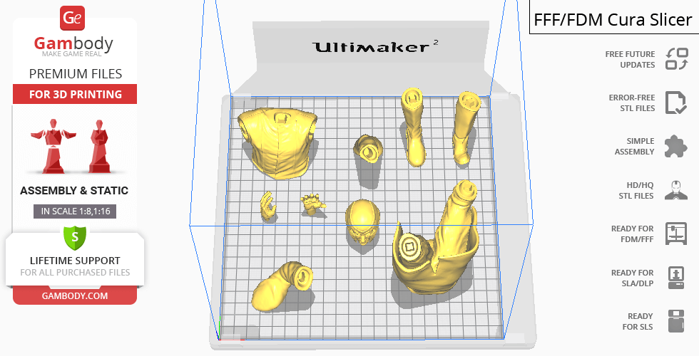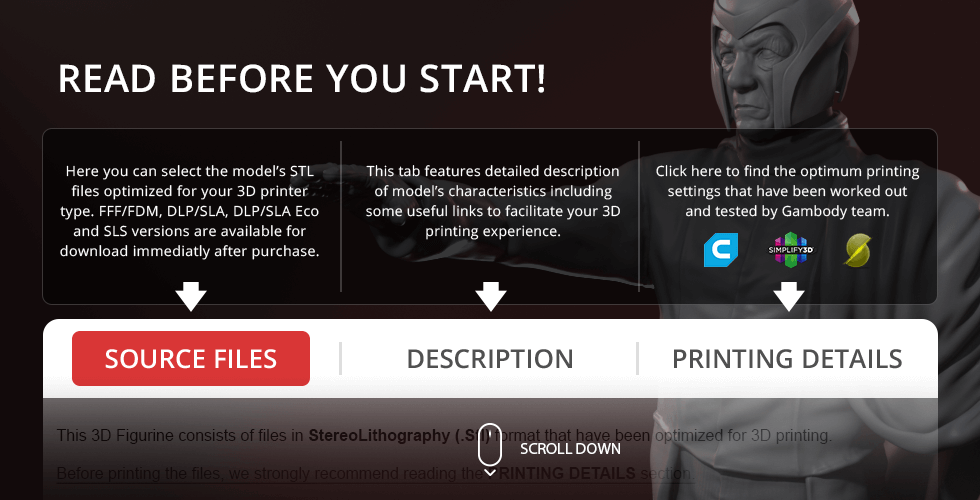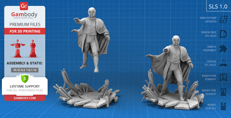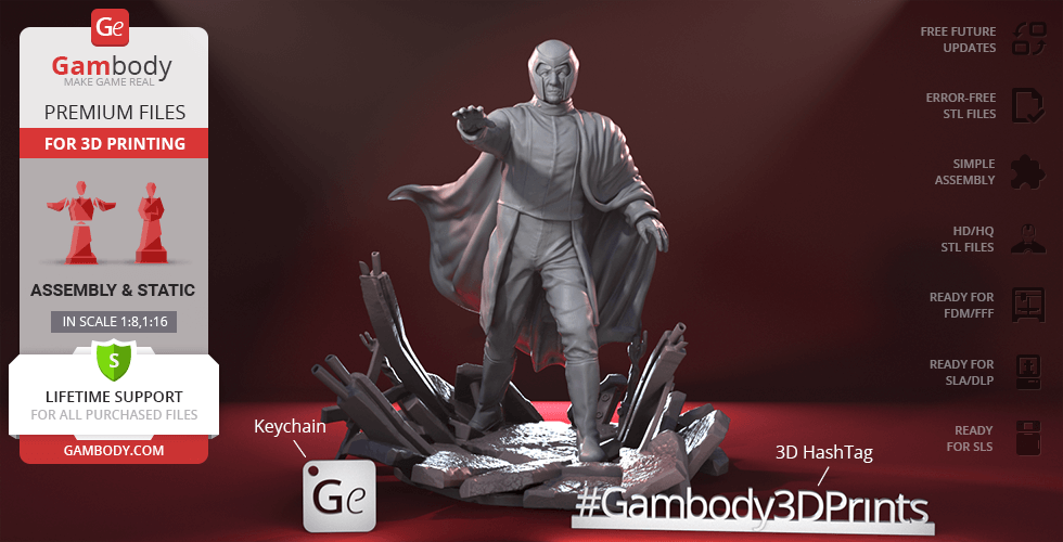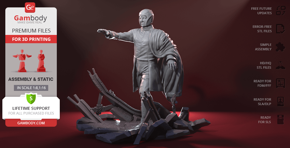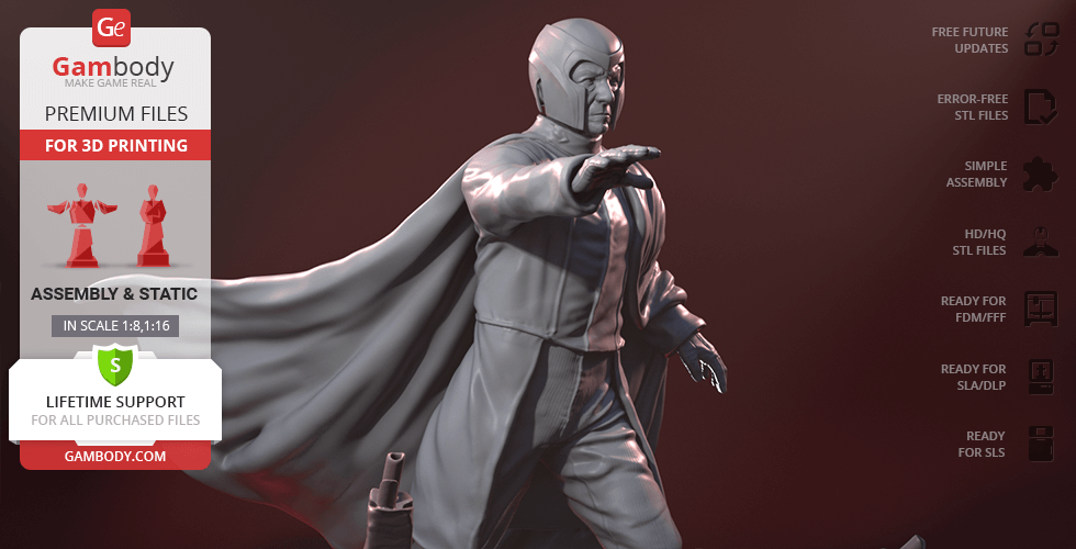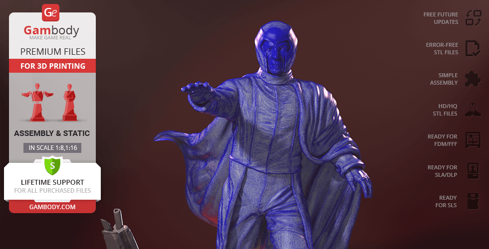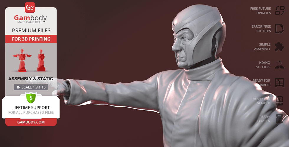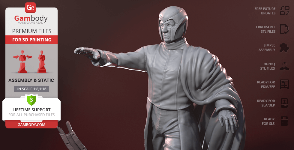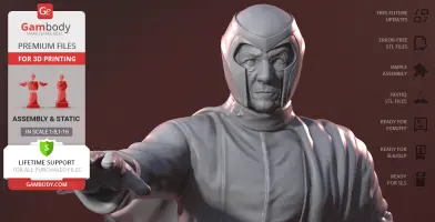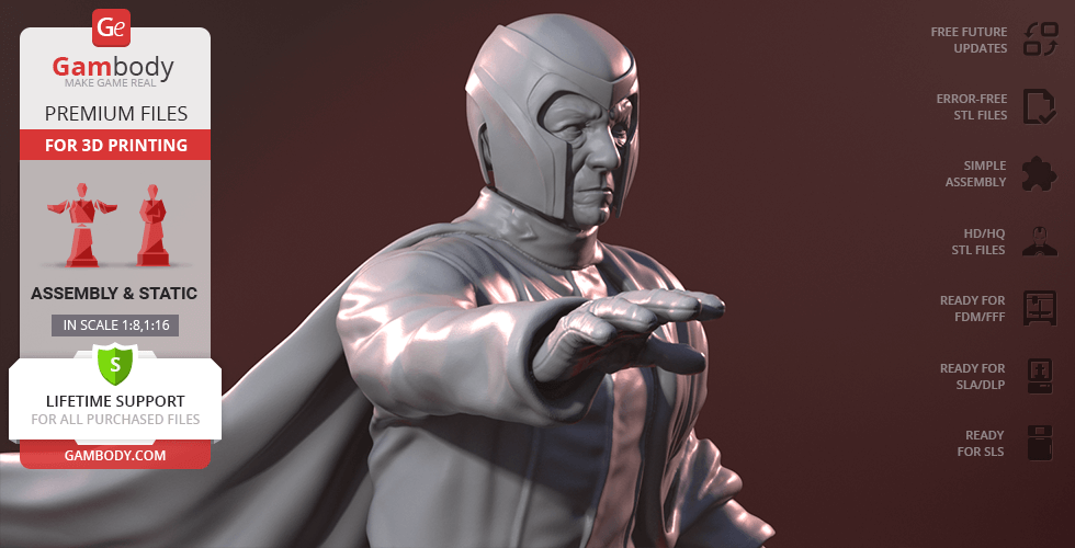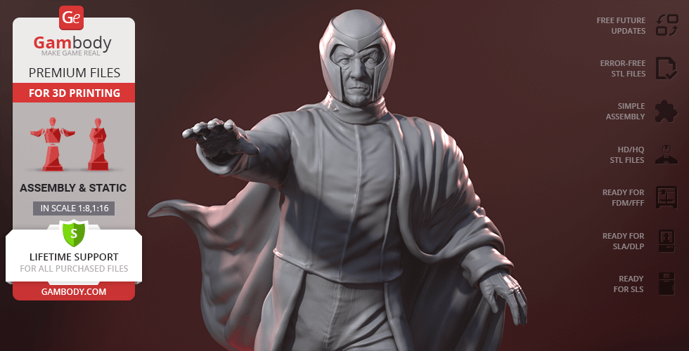 - STL files of Magneto 3D Model for 3D printing which consist of 38 parts;- 4 versions of files for this model for FFF/FDM, DLP/SLA, DLP/SLA Eco and SLS;- High-poly detailed figurine of Magneto;- Detailed settings that we provide as a recommendation for Cura , Simplify3D and Slic3r for the best print;- Full technical support from the Gambody Support Team.
