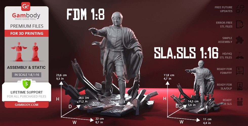 The model's scale was calculated from Magneto's actual height that is 1800 mm. The 3D printing figurine's chosen scale is 1/8 for the FFF/FDM version and 1/16 for the DLP/SLA/SLS versions.