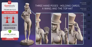 Specifically for Gambody customers, our contributing 3D artist invited Zatanna to showcase her tricks. The heroine is dressed in her spectacular magician attire and carries some useful props with her - the magic wand, a deck of cards, and a top hat always accompany the professional on stage! Are you ready to witness her performance in your 3D printing workshop?