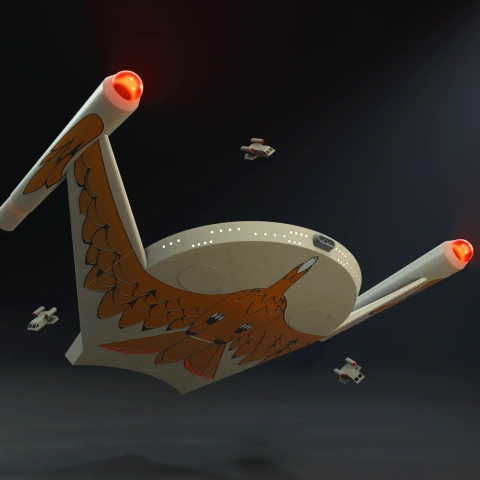 Futuristic spaceship model with intricate details, glowing lights, and multiple towers on a display stand.