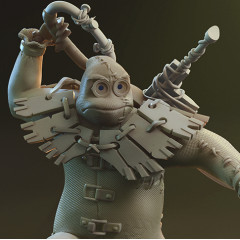 A stylized robot with long, flexible arms and a small creature on its head, set against a blurred background.