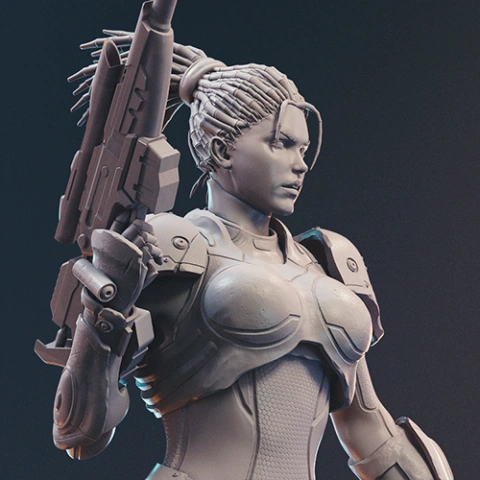A detailed 3D model of an armored character holding a large weapon, designed for 3D printing.