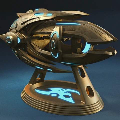 Futuristic spaceship model with intricate details and glowing blue elements on a stand.