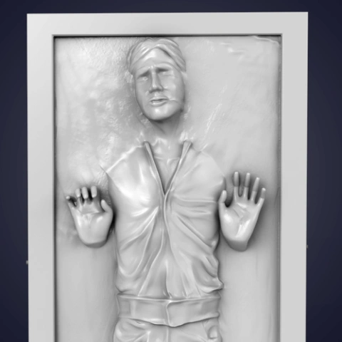 Person trapped in a carbonite slab, hands raised, detailed facial and clothing features.