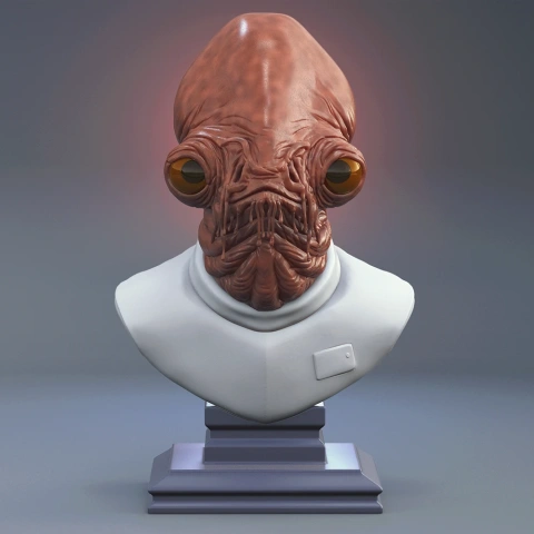 A detailed bust of a humanoid alien with large eyes, wearing a uniform, on a display stand.