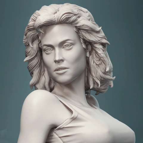3D model of a woman with wavy hair in a tank top, showcasing detailed facial features.