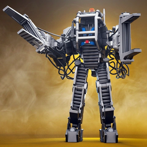 A detailed 3D model of a futuristic exoskeleton mech suit with mechanical arms and cables.