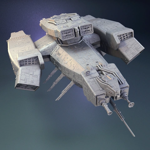Futuristic spacecraft model with intricate details and symmetrical design, suitable for 3D printing.