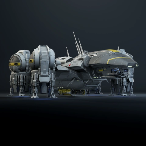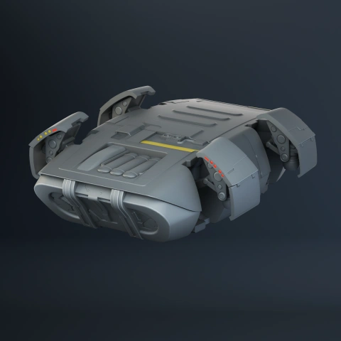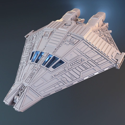 Futuristic, angular spacecraft with intricate surface details and tinted windows, designed for 3D printing.
