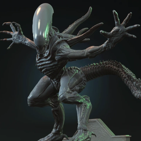 Detailed Xenomorph 3D model posed menacingly, featuring biomechanical elements and an elongated head.