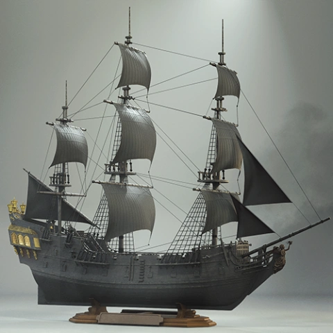 A detailed 3D model of a pirate ship with black sails, ready for 3D printing.