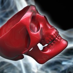 A 3D model of a red Japanese devil mask with large horns and sharp teeth.