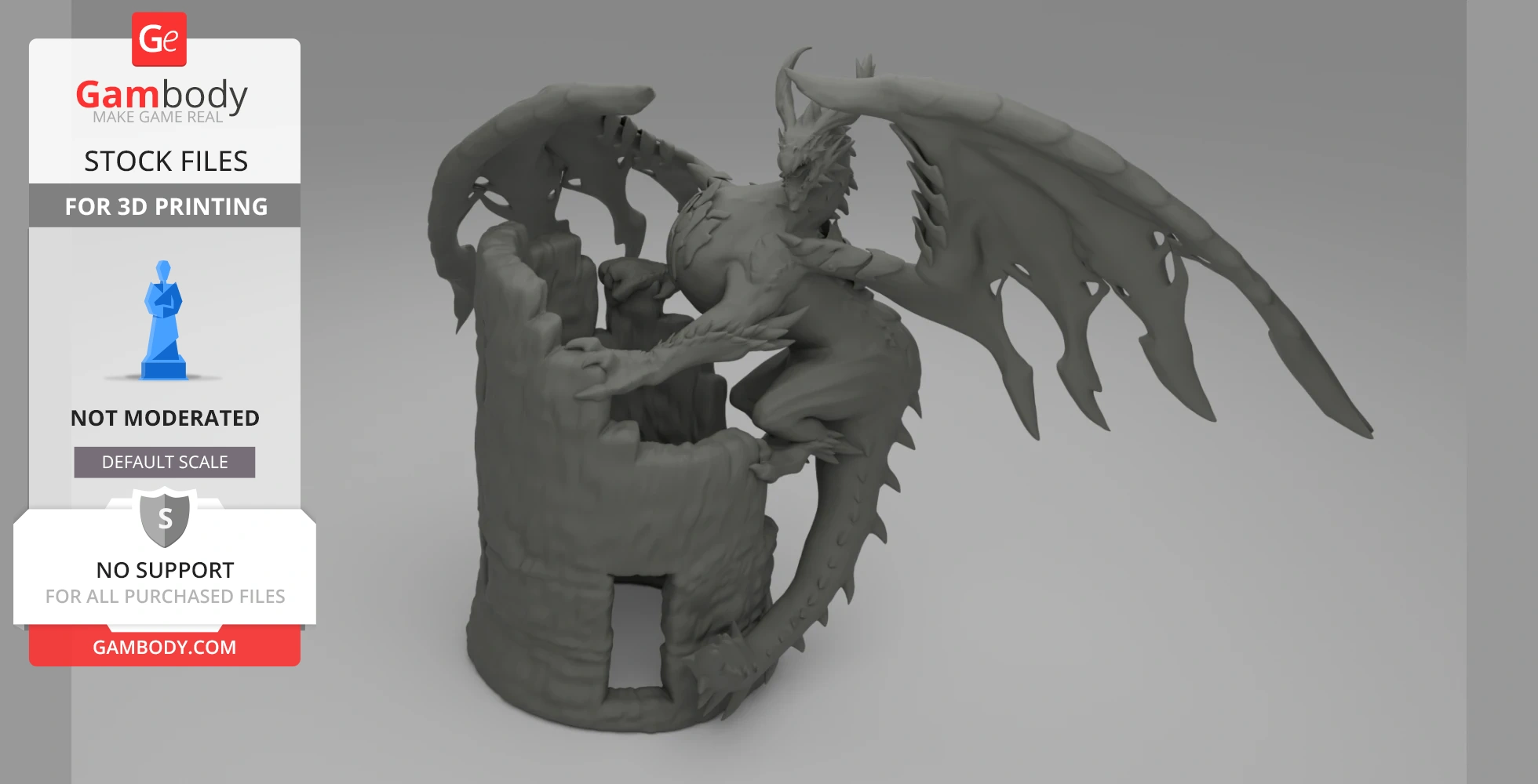 This model features a majestic dragon spreading its wings atop an ancient, crumbling stone tower. With its impressive stance and detailed design, it is a perfect piece for desktop decoration, collections, or diorama projects.