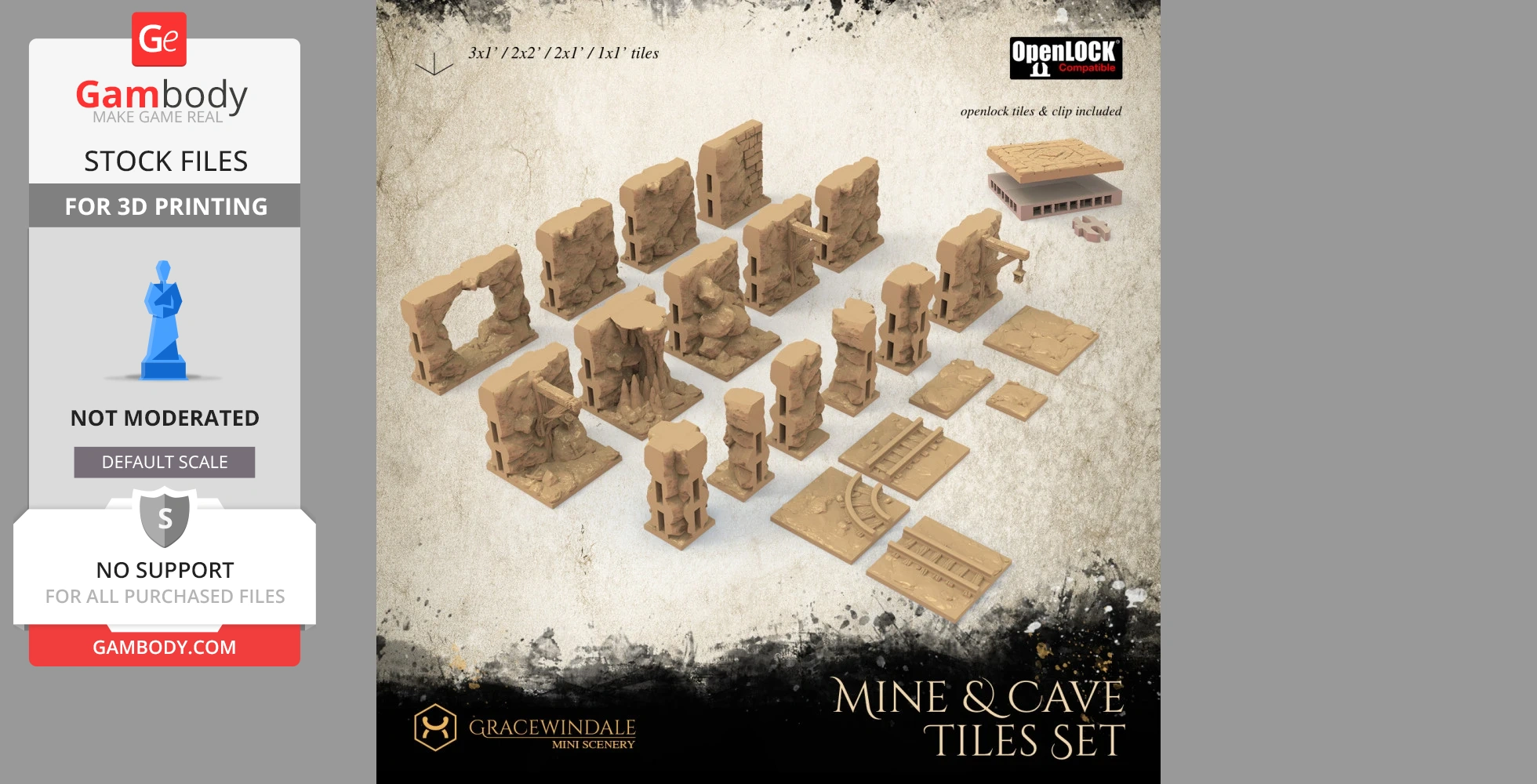 Mine & Cave Tiles set includes 3 version(s) for the supported 3D printer type(s): FFF/FDM, DLP/SLA, SLS. Files are available for download after purchase. See the Description and Specifications sections for more details about this model.