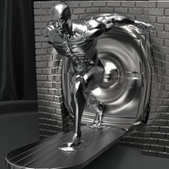 A metallic humanoid figure on a surfboard, emerging from a textured wall-like structure.