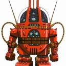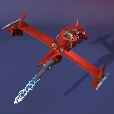 A red futuristic spacecraft model with a long body, wide wings, and a blue energy trail at the rear.