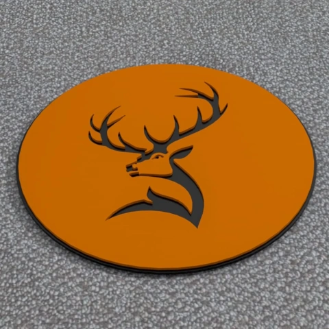 Round, orange coaster with a stylized black stag head silhouette in the center.