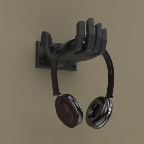A wall-mounted 3D-printed hand holding headphones as a hanger.